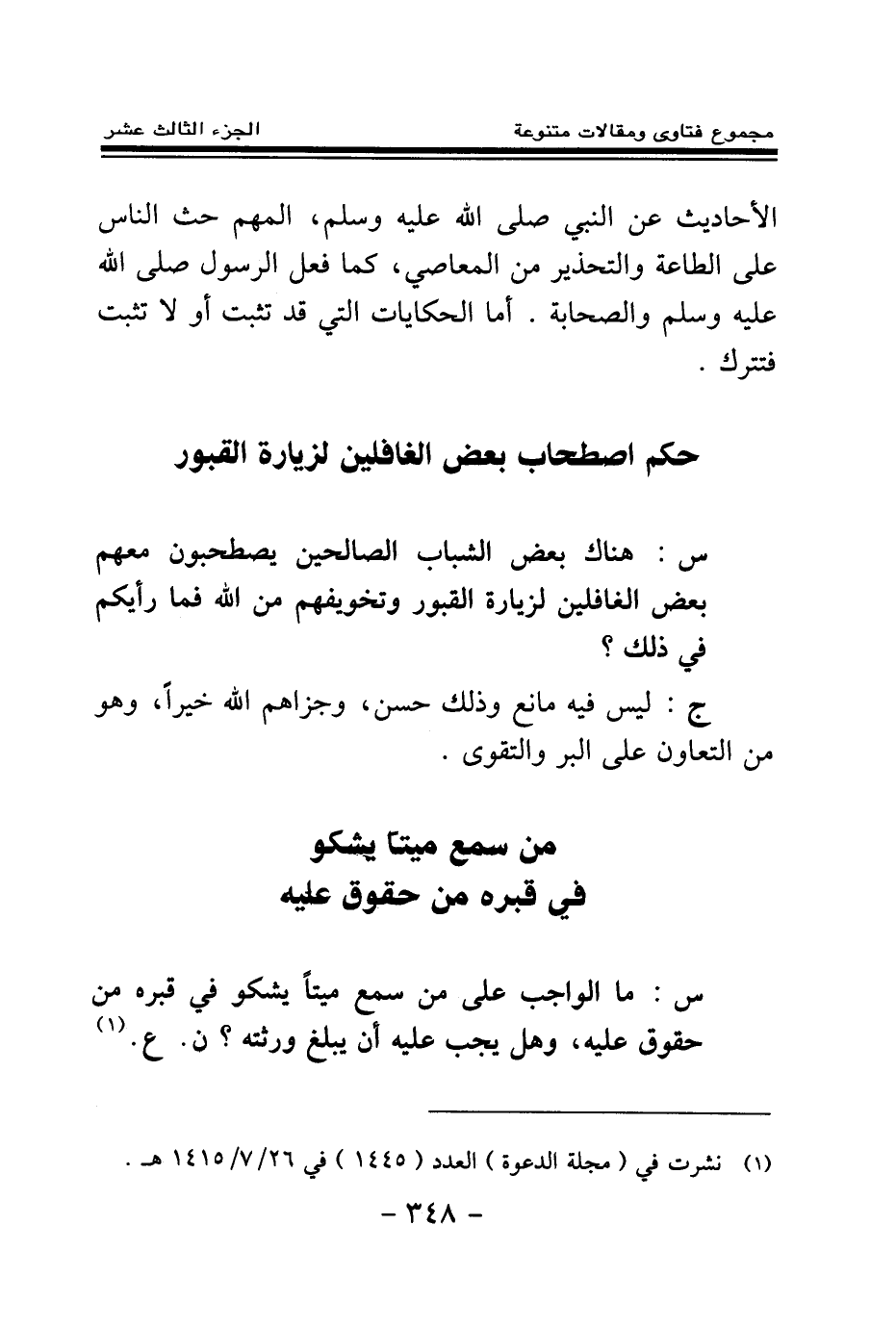 س: ما الواجب على من سمع ميتا يشكو في قبره من حقوق عليه، وهل يجب عليه أن يبلغ ورثته؟ ن. ع (¬1) .