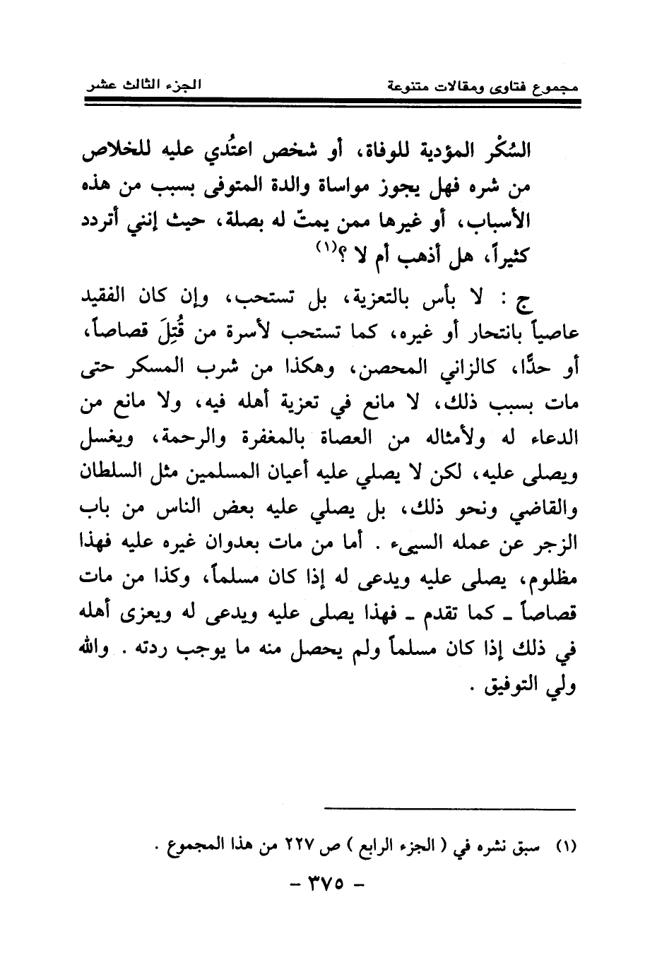 ج: لا بأس بالتعزية، بل تستحب، وإن كان الفقيد عاصيا بانتحار أو غيره، كما تستحب لأسرة من قتل قصاصا، أو حدا، كالزاني المحصن، وهكذا من شرب المسكر حتى مات بسبب ذلك، لا مانع في تعزية أهله فيه، ولا مانع من الدعاء له ولأمثاله من العصاة بالمغفرة والرحمة، ويغسل ويصلى عليه، لكن لا يصلي عليه أعيان المسلمين مثل السلطان والقاضي ونحو ذلك، بل يصلي عليه بعض الناس من باب الزجر عن عمله السيئ. أما من مات بعدوان غيره عليه فهذا مظلوم، يصلى عليه ويدعى له إذا كان مسلما، وكذا من مات قصاصا- كما تقدم- فهذا يصلى عليه ويدعى له ويعزى أهله في ذلك إذا كان مسلما ولم يحصل منه ما يوجب ردته. والله ولي التوفيق.