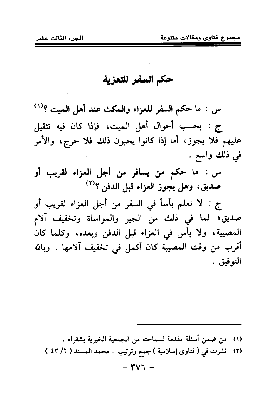 س: ما حكم من يسافر من أجل العزاء لقريب أو صديق، وهل يجوز العزاء قبل الدفن؟ (¬2) .