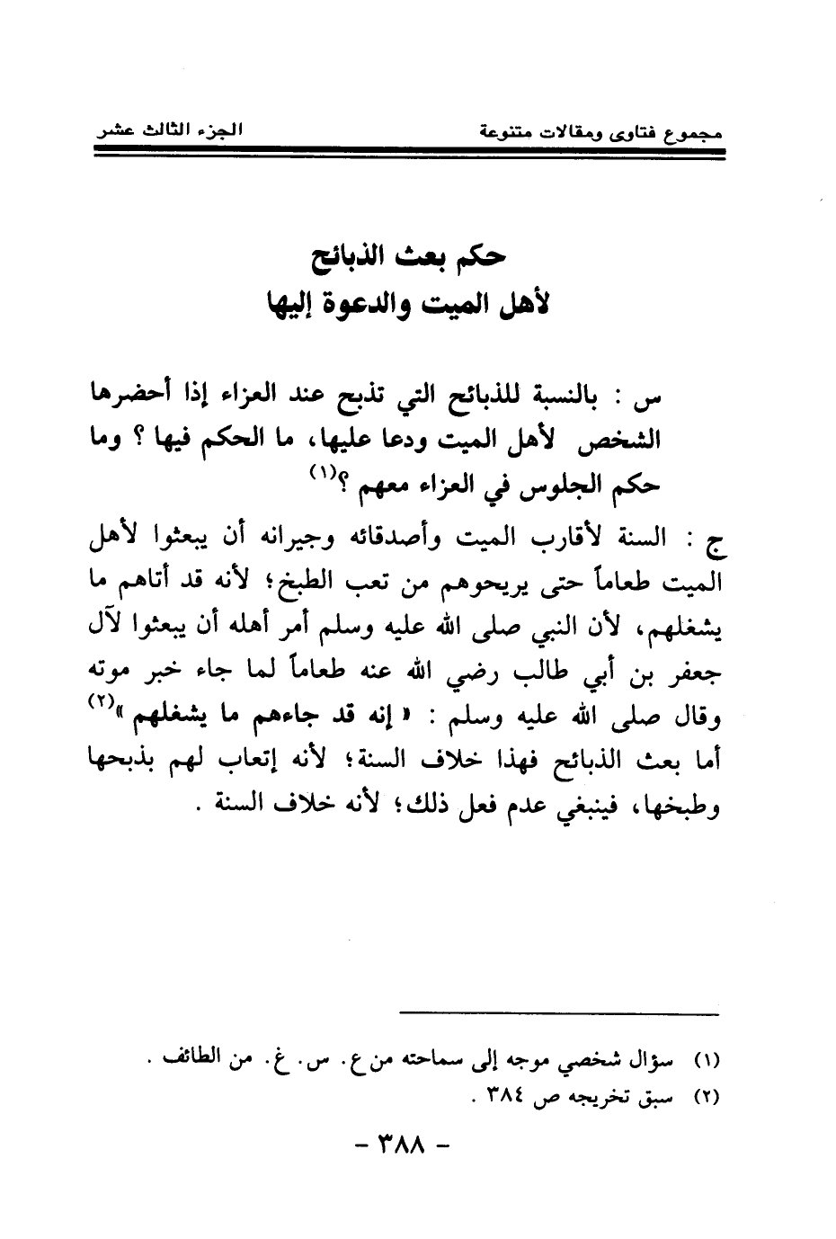 ج: السنة لأقارب الميت وأصدقائه وجيرانه أن يبعثوا لأهل الميت طعاما حتى يريحوهم من تعب الطبخ؛ لأنه قد أتاهم ما يشغلهم؛ لأن النبي صلى الله عليه وسلم أمر أهله أن يبعثوا لآل جعفر بن أبي طالب رضي الله عنه طعاما لما جاء خبر موته وقال صلى الله عليه وسلم: «إنه قد جاءهم ما يشغلهم (¬2) » أما بعث الذبائح فهذا خلاف السنة؛ لأنه إتعاب لهم بذبحها وطبخها، فينبغي عدم فعل ذلك؛ لأنه خلاف السنة.
