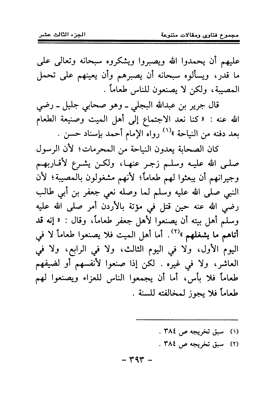 قال جرير بن عبد الله البجلي - وهو صحابي جليل- رضي الله عنه: «كنا نعد الاجتماع إلى أهل الميت وصنيعة الطعام بعد دفنه من النياحة (¬1) » رواه الإمام أحمد بإسناد حسن. كان الصحابة يعدون النياحة من المحرمات؛ لأن الرسول صلى الله عليه وسلم زجر عنها، ولكن يشرع لأقاربهم وجيرانهم أن يبعثوا لهم طعاما؛ لأنهم مشغولون بالمصيبة؛ لأن النبي صلى الله عليه وسلم «لما وصله نعي جعفر بن أبي طالب رضي الله عنه حين قتل في مؤتة بالأردن أمر صلى الله عليه وسلم أهل بيته أن يصنعوا لأهل جعفر طعاما، وقال: إنه قد أتاهم ما يشغلهم (¬2) » أما أهل الميت فلا يصنعوا طعاما لا في اليوم الأول، ولا في اليوم الثالث، ولا في الرابع، ولا في العاشر، ولا في غيره.