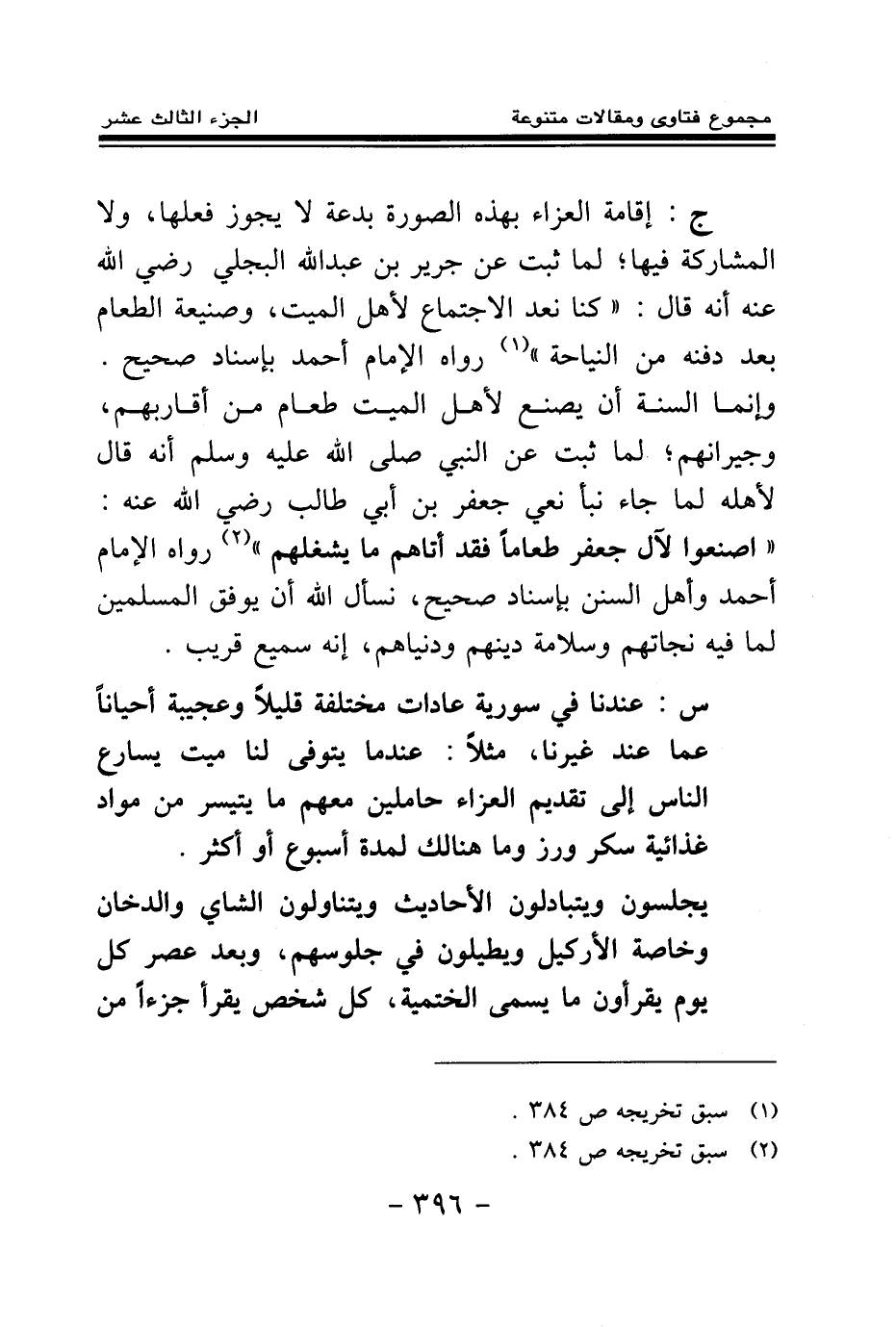 ج: إقامة العزاء بهذه الصورة بدعة لا يجوز فعلها، ولا المشاركة فيها؛ لما ثبت عن جرير بن عبد الله البجلي رضي الله عنه أنه قال «كنا نعد الاجتماع لأهل الميت وصنيعة الطعام بعد دفنه من النياحة (¬1) » رواه الإمام أحمد بإسناد صحيح. وإنما السنة أن يصنع لأهل الميت طعام من أقاربهم، وجيرانهم؛ لما ثبت عن النبي صلى الله عليه وسلم أنه «قال لأهله لما جاء نبأ نعي جعفر بن أبي طالب رضي الله عنه: اصنعوا لآل جعفر طعاما فقد أتاهم ما يشغلهم (¬2) » رواه الإمام أحمد وأهل السنن بإسناد صحيح، نسأل الله أن يوفق المسلمين لما فيه نجاتهم وسلامة دينهم ودنياهم، إنه سميع قريب. .