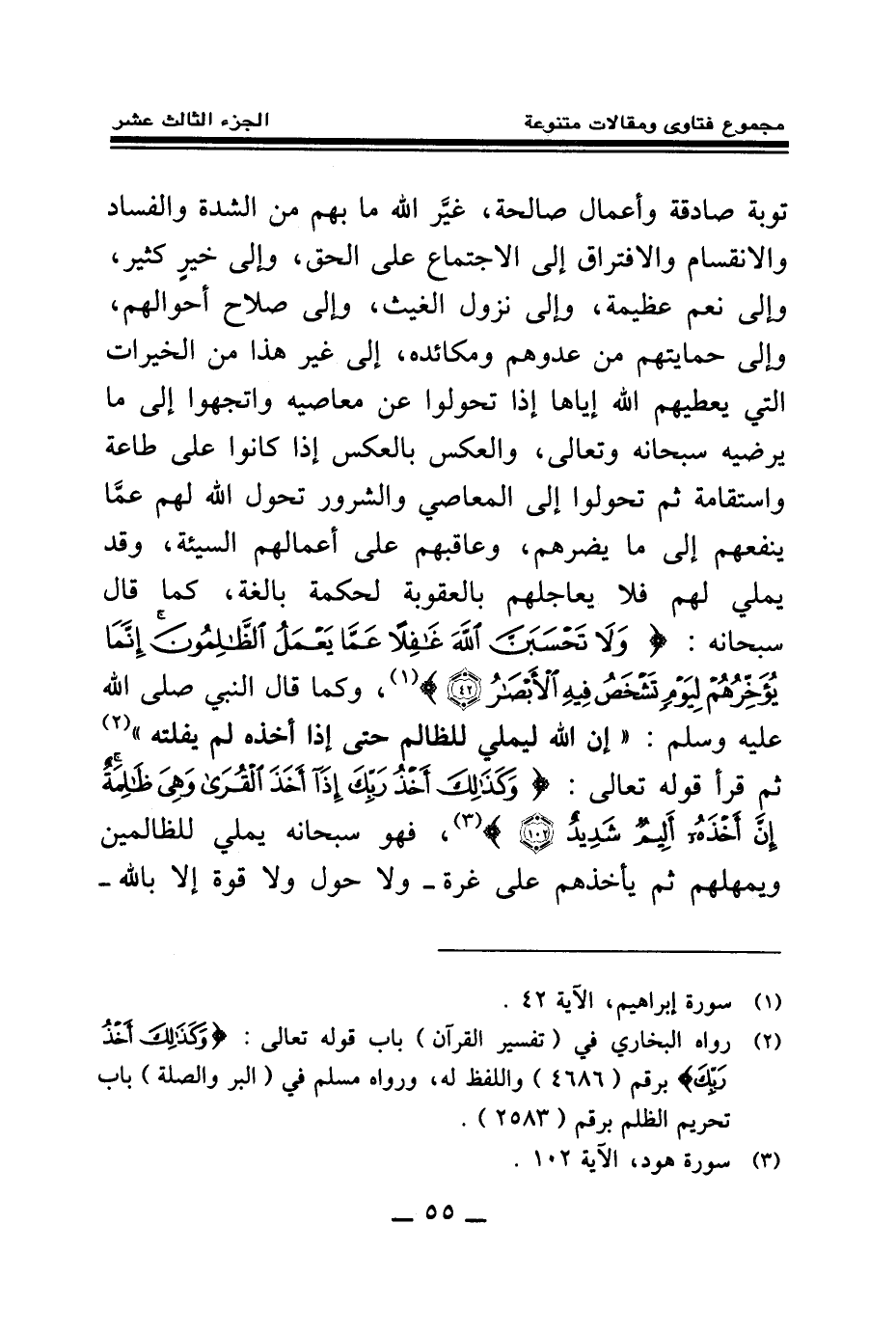 توبة صادقة وأعمال صالحة، غير الله ما بهم من الشدة والفساد والانقسام والافتراق إلى الاجتماع على الحق، وإلى خير كثير، وإلى نعم عظيمة، وإلى نزول الغيث، وإلى صلاح أحوالهم، وإلى حمايتهم من عدوهم ومكائده، إلى غير هذا من الخيرات التي يعطيهم الله إياها إذا تحولوا عن معاصيه واتجهوا إلى ما يرضيه سبحانه وتعالى، والعكس بالعكس إذا كانوا على طاعة واستقامة ثم تحولوا إلى المعاصي والشرور تحول الله لهم عما ينفعهم إلى ما يضرهم، وعاقبهم على أعمالهم السيئة، وقد يملي لهم فلا يعاجلهم بالعقوبة لحكمة بالغة، كما قال سبحانه: {وَلَا تَحْسَبَنَّ اللَّهَ غَافِلًا عَمَّا يَعْمَلُ الظَّالِمُونَ إِنَّمَا يُؤَخِّرُهُمْ لِيَوْمٍ تَشْخَصُ فِيهِ الْأَبْصَارُ} (¬1) وكما قال النبي صلى الله عليه وسلم: «إن الله ليملي للظالم حتى إذا أخذه لم يفلته (¬2) » ، ثم قرأ قوله تعالى: {وَكَذَلِكَ أَخْذُ رَبِّكَ إِذَا أَخَذَ الْقُرَى وَهِيَ ظَالِمَةٌ إِنَّ أَخْذَهُ أَلِيمٌ شَدِيدٌ} (¬3) فهو سبحانه يملي للظالمين ويمهلهم ثم يأخذهم على غرة - ولا حول ولا قوة إلا بالله -