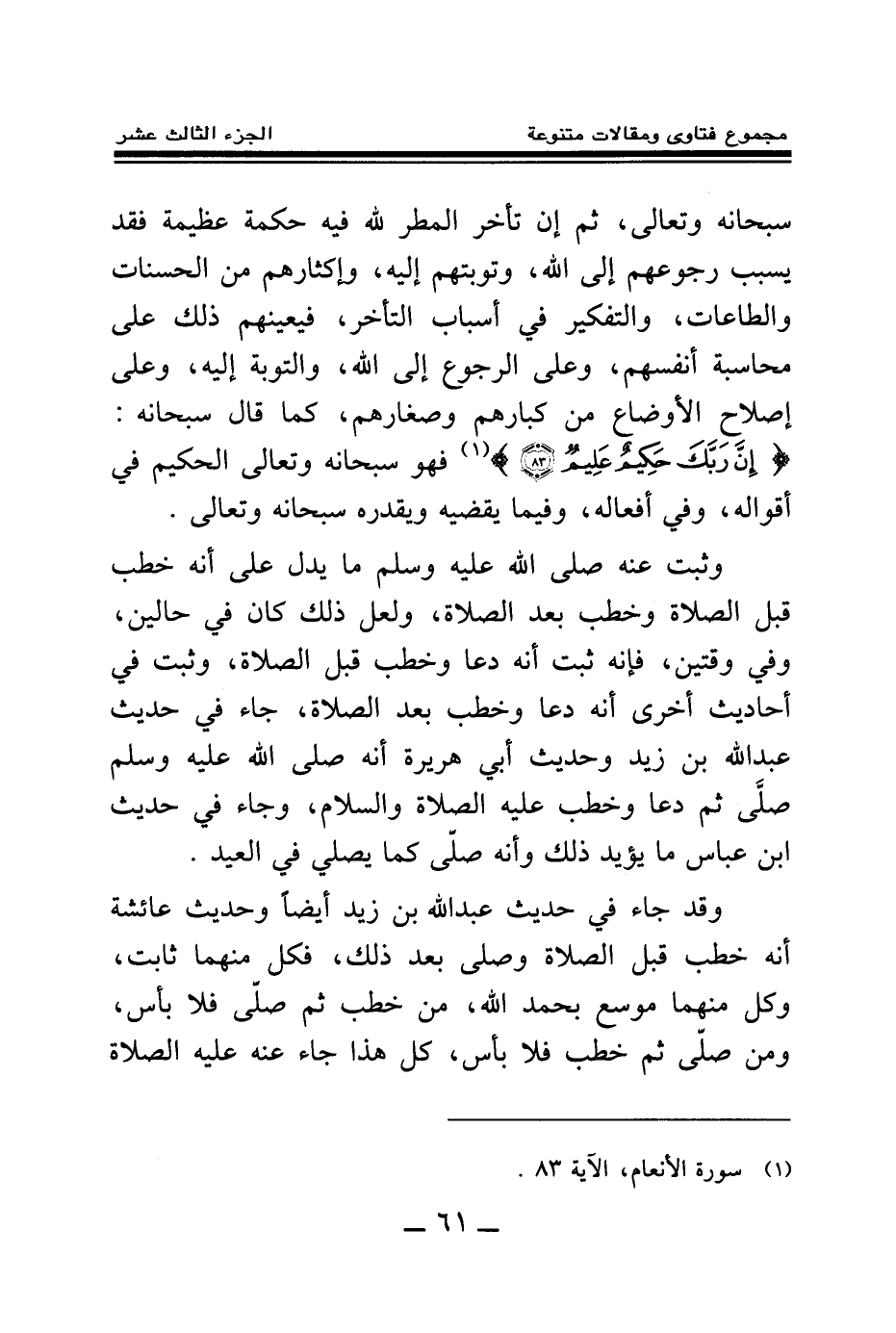 سبحانه وتعالى، ثم إن تأخر المطر لله فيه حكمة عظيمة فقد يسبب رجوعهم إلى الله، وتوبتهم إليه، وإكثارهم من الحسنات والطاعات، والتفكير في أسباب التأخر، فيعينهم ذلك على محاسبة أنفسهم، وعلى الرجوع إلى الله، والتوبة إليه، وعلى إصلاح الأوضاع من كبارهم وصغارهم، كما قال سبحانه: {إِنَّ رَبَّكَ حَكِيمٌ عَلِيمٌ} (¬1) فهو سبحانه وتعالى الحكيم في أقواله، وفي أفعاله، وفيما يقضيه ويقدره سبحانه وتعالى. وثبت عنه صلى الله عليه وسلم ما يدل على أنه خطب قبل الصلاة وخطب بعد الصلاة، ولعل ذلك كان في حالين، وفي وقتين، فإنه ثبت أنه دعا وخطب قبل الصلاة، وثبت في أحاديث أخرى أنه دعا وخطب بعد الصلاة، جاء في حديث عبد الله بن زيد وحديث أبي هريرة أنه صلى الله عليه وسلم صلى ثم دعا وخطب عليه الصلاة والسلام، وجاء في حديث ابن عباس ما يؤيد ذلك، وأنه صلى كما يصلي في العيد.