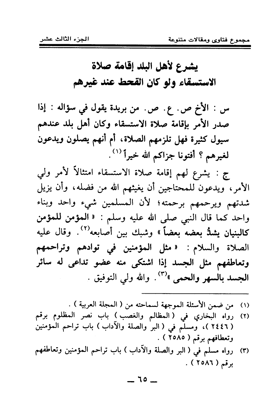 ج: يشرع لهم إقامة صلاة الاستسقاء امتثالا لأمر ولي الأمر، ويدعون للمحتاجين أن يغيثهم الله من فضله، وأن يزيل شدتهم ويرحمهم برحمته؛ لأن المسلمين شيء واحد وبناء واحد كما قال النبي صلى الله عليه وسلم: «المؤمن للمؤمن كالبنيان يشد بعضه بعضا وشبك بين أصابعه (¬2) » ، وقال عليه الصلاة والسلام: «مثل المؤمنين في توادهم وتراحمهم وتعاطفهم مثل الجسد إذا اشتكى منه عضو تداعى له سائر الجسد بالسهر والحمى (¬3) » والله ولي التوفيق.