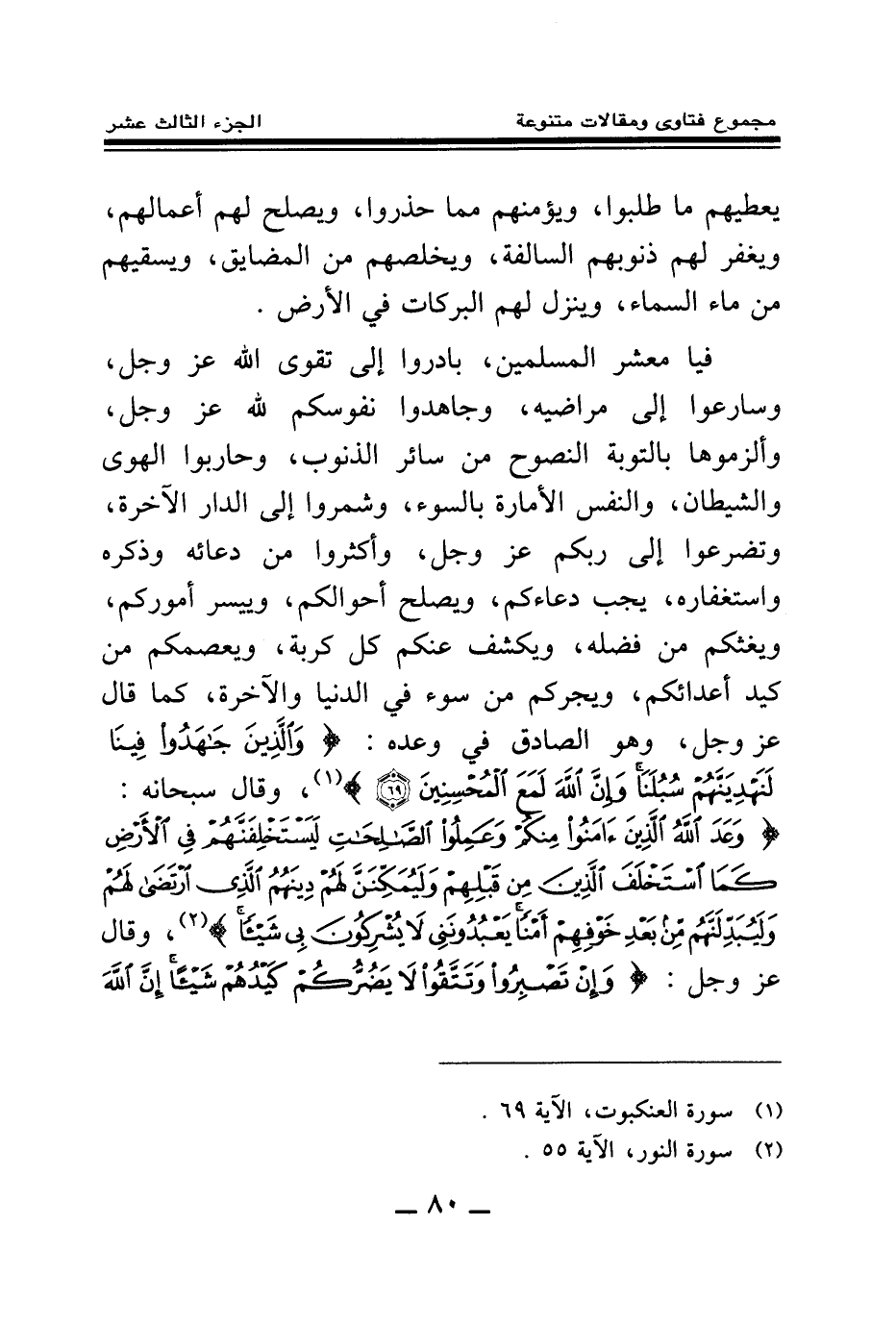 فيا معشر المسلمين، بادروا إلى تقوى الله عز وجل، وسارعوا إلى مراضيه، وجاهدوا نفوسكم لله عز وجل، وألزموها بالتوبة النصوح من سائر الذنوب، وحاربوا الهوى والشيطان، والنفس الأمارة بالسوء، وشمروا إلى الدار الآخرة، وتضرعوا إلى ربكم عز وجل، وأكثروا من دعائه وذكره واستغفاره، يجب دعاءكم، ويصلح أحوالكم، وييسر أموركم، ويغثكم من فضله، ويكشف عنكم كل كربة، ويعصمكم من كيد أعدائكم، ويجركم من سوء في الدنيا والآخرة، كما قال عز وجل، وهو الصادق في وعده: {وَالَّذِينَ جَاهَدُوا فِينَا لَنَهْدِيَنَّهُمْ سُبُلَنَا وَإِنَّ اللَّهَ لَمَعَ الْمُحْسِنِينَ} (¬1) وقال سبحانه: {وَعَدَ اللَّهُ الَّذِينَ آمَنُوا مِنْكُمْ وَعَمِلُوا الصَّالِحَاتِ لَيَسْتَخْلِفَنَّهُمْ فِي الْأَرْضِ كَمَا اسْتَخْلَفَ الَّذِينَ مِنْ قَبْلِهِمْ وَلَيُمَكِّنَنَّ لَهُمْ دِينَهُمُ الَّذِي ارْتَضَى لَهُمْ وَلَيُبَدِّلَنَّهُمْ مِنْ بَعْدِ خَوْفِهِمْ أَمْنًا يَعْبُدُونَنِي لَا يُشْرِكُونَ بِي شَيْئًا} (¬2) وقال عز وجل: {وَإِنْ تَصْبِرُوا وَتَتَّقُوا لَا يَضُرُّكُمْ كَيْدُهُمْ شَيْئًا إِنَّ اللَّهَ بِمَا يَعْمَلُونَ مُحِيطٌ} (¬3)