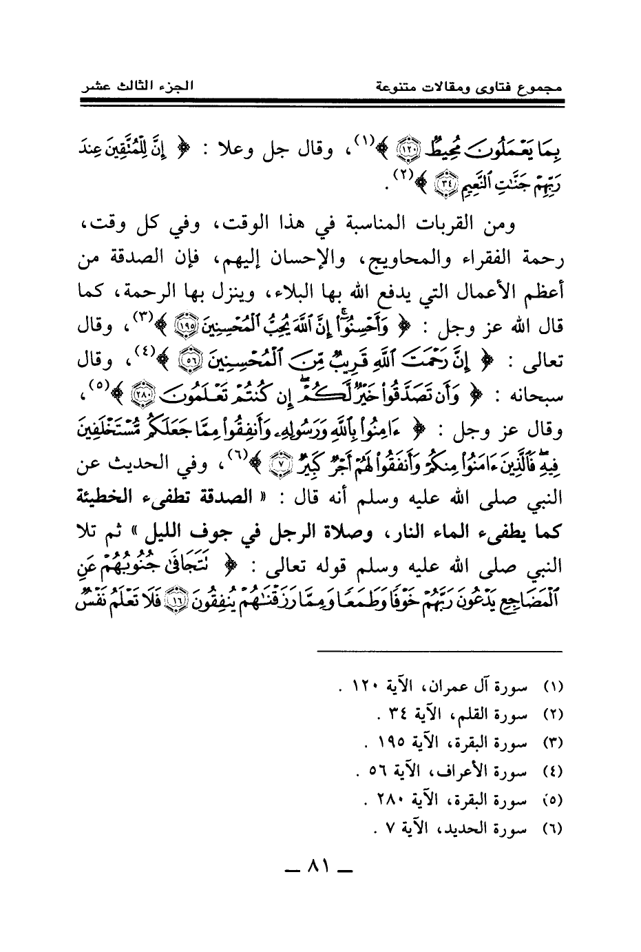 وقال جل وعلا: {إِنَّ لِلْمُتَّقِينَ عِنْدَ رَبِّهِمْ جَنَّاتِ النَّعِيمِ} (¬1) ومن القربات المناسبة في هذا الوقت، وفي كل وقت، رحمة الفقراء والمحاويج، والإحسان إليهم، فإن الصدقة من أعظم الأعمال التي يدفع الله بها البلاء، وينزل بها الرحمة، كما قال الله عز وجل: {وَأَحْسِنُوا إِنَّ اللَّهَ يُحِبُّ الْمُحْسِنِينَ} (¬2) وقال تعالى: {إِنَّ رَحْمَتَ اللَّهِ قَرِيبٌ مِنَ الْمُحْسِنِينَ} (¬3) وقال سبحانه: {وَأَنْ تَصَدَّقُوا خَيْرٌ لَكُمْ إِنْ كُنْتُمْ تَعْلَمُونَ} (¬4) وقال عز وجل: {آمِنُوا بِاللَّهِ وَرَسُولِهِ وَأَنْفِقُوا مِمَّا جَعَلَكُمْ مُسْتَخْلَفِينَ فِيهِ فَالَّذِينَ آمَنُوا مِنْكُمْ وَأَنْفَقُوا لَهُمْ أَجْرٌ كَبِيرٌ} (¬5) وفي الحديث عن النبي صلى الله عليه وسلم أنه قال: «الصدقة تطفئ الخطيئة كما يطفئ الماء النار وصلاة الرجل في جوف الليل ثم تلا النبي صلى الله عليه وسلم قوله تعالى: (¬8) »