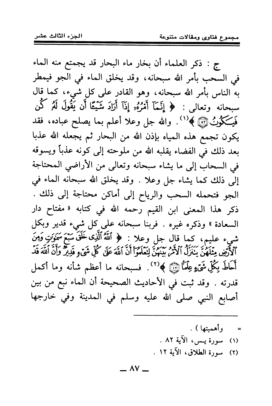 ج: ذكر العلماء أن بخار ماء البحار قد يجمتع منه الماء في السحب بأمر الله سبحانه، وقد يخلق الماء في الجو فيمطر به الناس بأمر الله سبحانه، وهو القادر على كل شيء، كما قال سبحانه وتعالى: {إِنَّمَا أَمْرُهُ إِذَا أَرَادَ شَيْئًا أَنْ يَقُولَ لَهُ كُنْ فَيَكُونُ} (¬1) والله جل وعلا أعلم بما يصلح عباده، فقد يكون تجمع هذه المياه بإذن الله من البحار ثم يجعله الله عذبا بعد ذلك في الفضاء يقلبه الله من ملوحته إلى كونه عذبا، ويسوقه في السحاب إلى ما يشاء سبحانه وتعالى من الأراضي المحتاجة إلى ذلك كما يشاء جل وعلا، وقد يخلق الله سبحانه الماء في الجو فتحمله السحب والرياح إلى أماكن محتاجة إلى ذلك، ذكر هذا المعنى ابن القيم رحمه الله في كتابه "مفتاح دار السعادة" وذكره غيره. فربنا سبحانه على كل شيء قدير وبكل شيء عليم، كما قال جل وعلا: {اللَّهُ الَّذِي خَلَقَ سَبْعَ سَمَاوَاتٍ وَمِنَ الْأَرْضِ مِثْلَهُنَّ يَتَنَزَّلُ الْأَمْرُ بَيْنَهُنَّ لِتَعْلَمُوا أَنَّ اللَّهَ عَلَى كُلِّ شَيْءٍ قَدِيرٌ وَأَنَّ اللَّهَ قَدْ أَحَاطَ بِكُلِّ شَيْءٍ عِلْمًا} (¬2) فسبحانه ما أعظم شأنه وما أكمل قدرته، وقد ثبت في الأحاديث الصحيحة أن الماء نبع من بين أصابع النبي صلى الله عليه وسلم في المدينة وفي خارجها