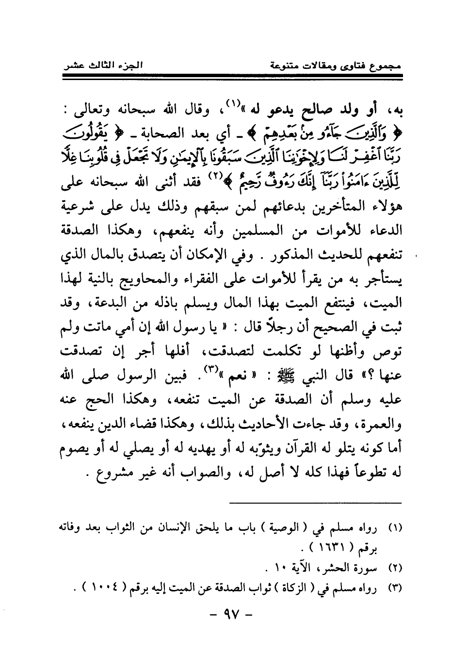 به، أو ولد صالح يدعو له (¬1) » ، وقال الله سبحانه وتعالى: {وَالَّذِينَ جَاءُوا مِنْ بَعْدِهِمْ} (¬2) - أي بعد الصحابة - {يَقُولُونَ رَبَّنَا اغْفِرْ لَنَا وَلِإِخْوَانِنَا الَّذِينَ سَبَقُونَا بِالْإِيمَانِ وَلَا تَجْعَلْ فِي قُلُوبِنَا غِلًّا لِلَّذِينَ آمَنُوا رَبَّنَا إِنَّكَ رَءُوفٌ رَحِيمٌ} (¬3) فقد أثنى الله سبحانه على هؤلاء المتأخرين بدعائهم لمن سبقهم، وذلك يدل على شرعية الدعاء للأموات من المسلمين وأنه ينفعهم، وهكذا الصدقة تنفعهم للحديث المذكور، وفي الإمكان أن يتصدق بالمال الذي يستأجر به من يقرأ للأموات على الفقراء والمحاويج بالنية لهذا الميت، فينتفع الميت بهذا المال ويسلم باذله من البدعة، وقد ثبت في الصحيح «أن رجلا قال يا رسول الله إن أمي ماتت ولم توص وأظنها لو تكلمت لتصدقت، أفلها أجر إن تصدقت عنها قال النبي صلى الله عليه وسلم: نعم (¬4) » ، فبين الرسول صلى الله عليه وسلم أن الصدقة عن الميت تنفعه، وهكذا الحج عنه والعمرة، وقد جاءت الأحاديث بذلك، وهكذا قضاء الدين ينفعه، أما كونه يتلو له القرآن ويثوبه له أو يهديه له أو يصلي له أو يصوم له تطوعا فهذا كله لا أصل له، والصواب أنه غير مشروع.