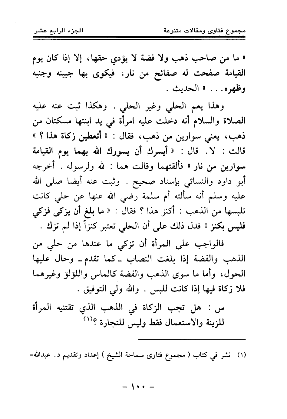 وهذا يعم الحلي وغير الحلي. وهكذا «ثبت عنه - عليه الصلاة والسلام - أنه دخلت عليه امرأة في يد ابنتها مسكتان من ذهب، يعني سوارين من ذهب، فقال: أتعطين زكاة هذا؟ قالت: لا. قال: أيسرك أن يسورك الله بهما يوم القيامة سوارين من نار (¬2) » فألقتهما وقالت هما: لله ولرسوله. أخرجه أبو داود والنسائي بإسناد صحيح. وثبت عنه أيضا - صلى الله عليه وسلم - أنه «سألته أم سلمة - رضي الله عنها - عن حلي كانت تلبسها من الذهب: أكنز هذا؟ فقال: ما بلغ أن يزكى فزكي فليس بكنز (¬3) » فدل ذلك على أن الحلي تعتبر كنزا إذا لم تزك. فالواجب على المرأة أن تزكي ما عندها من حلي من الذهب والفضة إذا بلغت النصاب - كما تقدم - وحال عليها الحول، وأما ما سوى الذهب والفضة كالماس واللؤلؤ وغيرهما فلا زكاة فيها إذا كانت للبس. والله ولي التوفيق.
