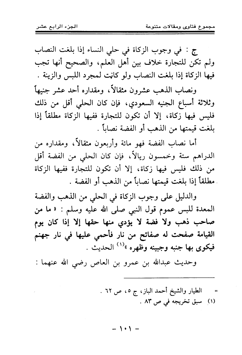 ج: في وجوب الزكاة في حلي النساء إذا بلغت النصاب ولم تكن للتجارة خلاف بين أهل العلم، والصحيح أنها تجب فيها الزكاة إذا بلغت النصاب، ولو كانت لمجرد اللبس والزينة. ونصاب الذهب عشرون مثقالا، ومقداره أحد عشر جنيها وثلاثة أسباع الجنيه السعودي، فإن كان الحلي أقل من ذلك فليس فيها زكاة، إلا أن تكون للتجارة ففيها الزكاة مطلقا إذا بلغت قيمتها من الذهب أو الفضة نصابا.