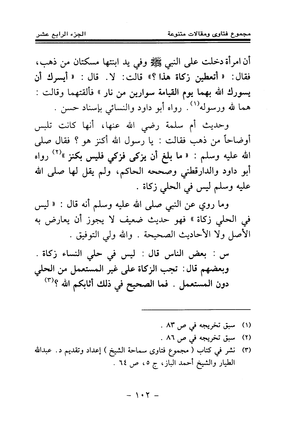 (¬2) رواه أبو داود في (الزكاة) باب الكنز ما هو وزكاة الحلي برقم (1564) .