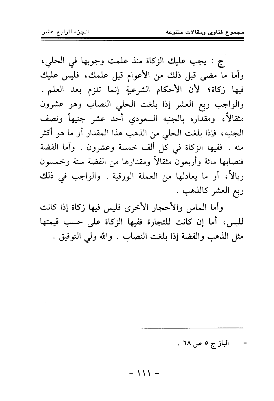 ج: يجب عليك الزكاة منذ علمت وجوبها في الحلي، وأما ما مضى قبل ذلك من الأعوام قبل علمك، فليس عليك فيها زكاة؛ لأن الأحكام الشرعية إنما تلزم بعد العلم. والواجب ربع العشر إذا بلغت الحلي النصاب وهو عشرون مثقالا، ومقداره بالجنيه السعودي أحد عشر جنيها ونصف الجنيه، فإذا بلغت الحلي من الذهب هذا المقدار أو ما هو أكثر منه، ففيها الزكاة في كل ألف خمسة وعشرون. وأما الفضة فنصابها مائة وأربعون مثقالا ومقدارها من الفضة ستة وخمسون ريالا، أو ما يعادلها من العملة الورقية. والواجب في ذلك ربع العشر كالذهب.
