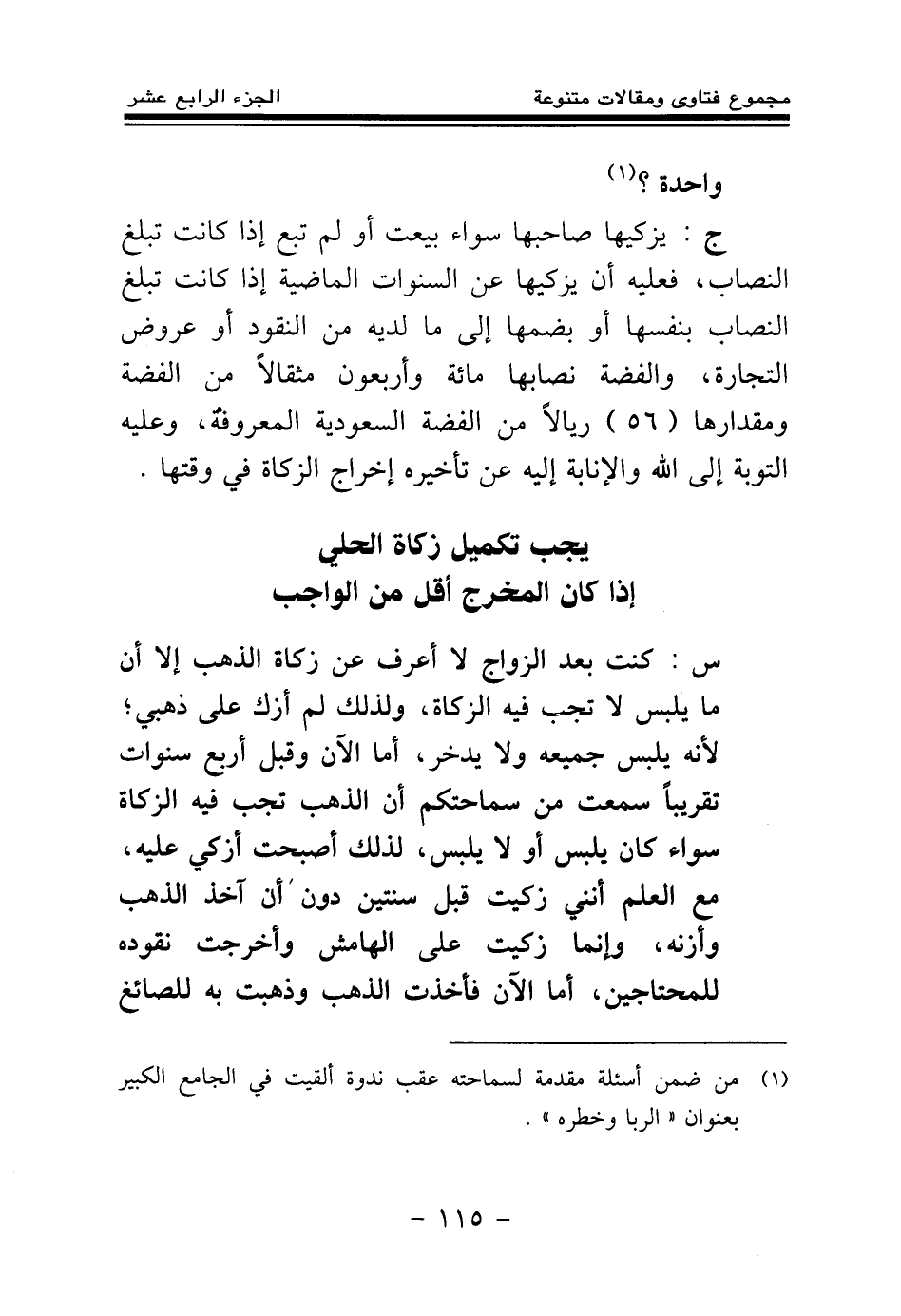 س: كنت بعد الزواج لا أعرف عن زكاة الذهب إلا أن ما للبس لا تجب فيه الزكاة، ولذلك لم أزك على ذهبي؛ لأنه يلبس جميعه ولا يدخر، أما الآن وقبل أربع سنوات تقريبا سمعت من سماحتكم أن الذهب تجب فيه الزكاة سواء كان يلبس أو لا يلبس، لذلك أصبحت أزكي عليه، مع العلم أنني زكيت قبل سنتين دون أن آخذ الذهب وأزنه، وإنما زكيت على الهامش وأخرجت نقوده للمحتاجين، أما الآن فأخذت الذهب وذهبت به للصائغ