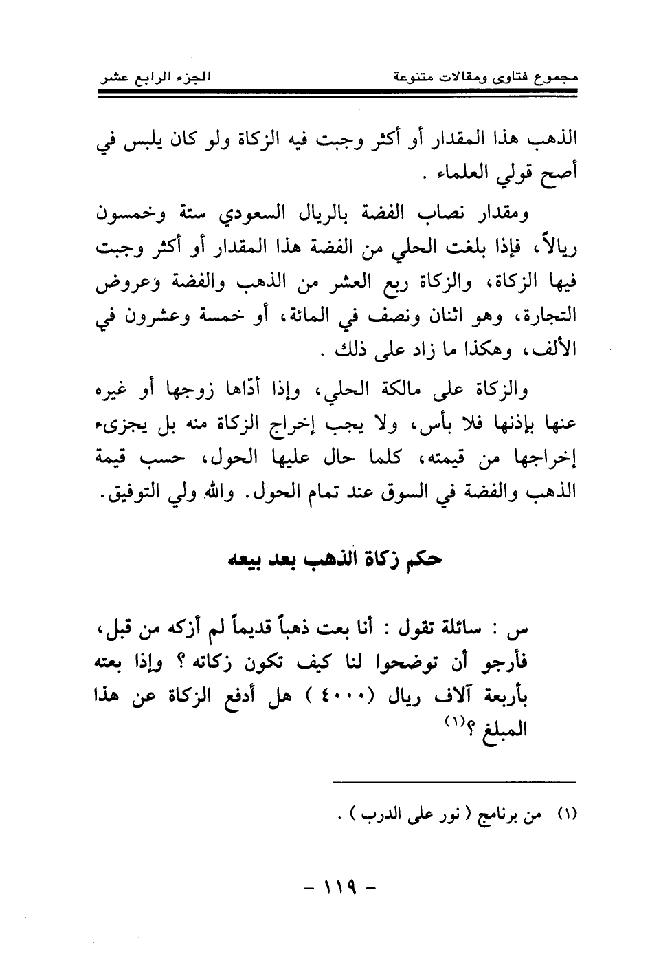 ومقدار نصاب الفضة بالريال السعودي ستة وخمسون ريالا، فإذا بلغت الحلي من الفضة هذا المقدار أو أكثر وجبت فيها الزكاة، والزكاة ربع العشر من الذهب والفضة وعروض التجارة، وهو اثنان ونصف في المائة، أو خمسة وعشرون في الألف، وهكذا ما زاد على ذلك.