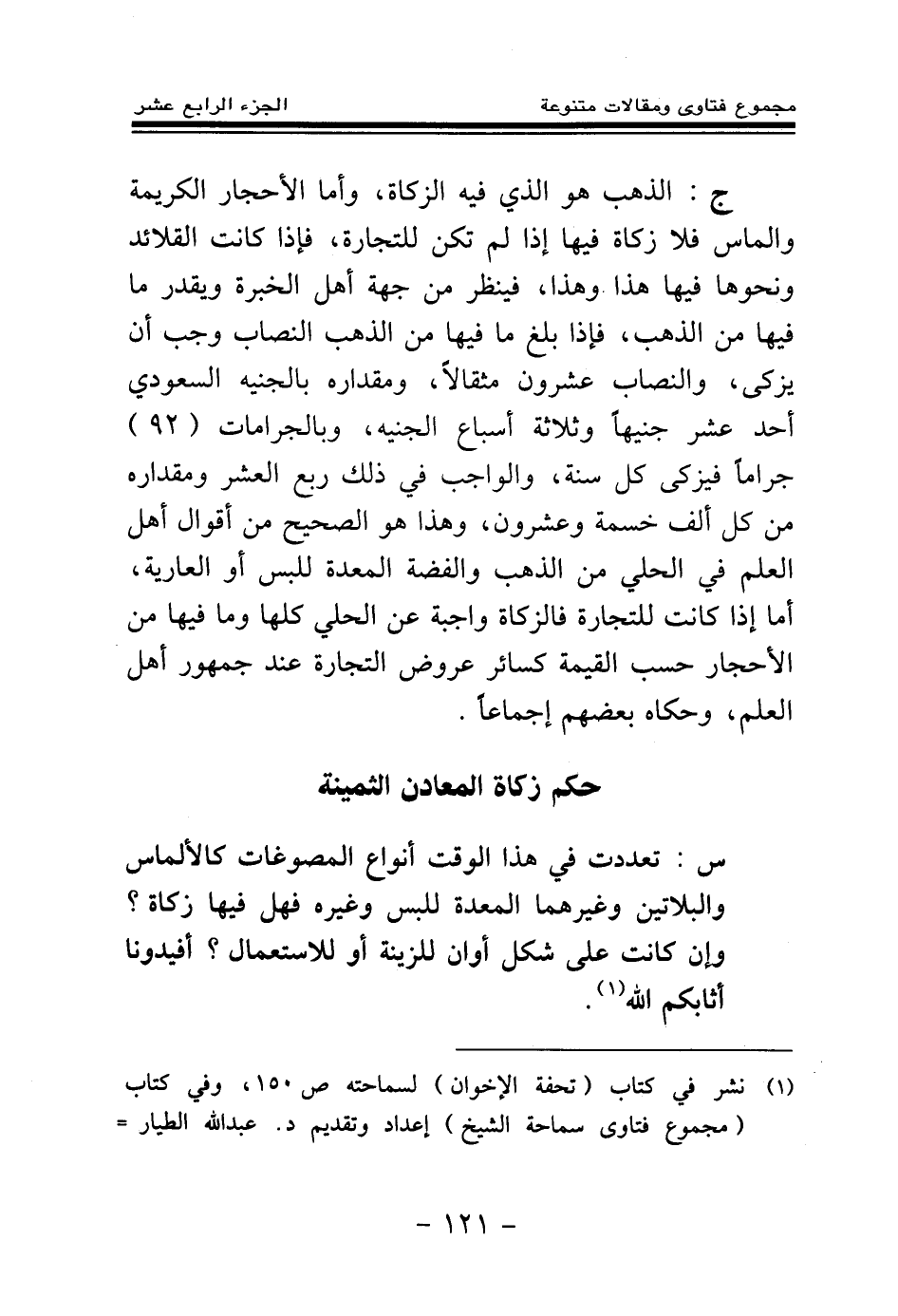 ج: الذهب هو الذي فيه الزكاة، وأما الأحجار الكريمة والماس فلا زكاة فيها إذا لم تكن للتجارة، فإذا كانت القلائد ونحوها فيها هذا وهذا، فينظر من جهة أهل الخبرة ويقدر ما فيها من الذهب، فإذا بلغ ما فيها من الذهب النصاب وجب أن يزكى، والنصاب عشرون مثقالا، ومقداره بالجنيه السعودي أحد عشر جنيها وثلاثة أسباع الجنيه، وبالجرامات (92) جراما فيزكى كل سنة، والواجب في ذلك ربع العشر ومقداره من كل ألف خمسة وعشرون، وهذا هو الصحيح من أقوال أهل العلم في الحلي من الذهب والفضة المعدة للبس أو العارية، أما إذا كانت للتجارة فالزكاة واجبة عن الحلي كلها وما فيها من الأحجار حسب القيمة كسائر عروض التجارة عند جمهور أهل العلم، وحكاه بعضهم إجماعا.