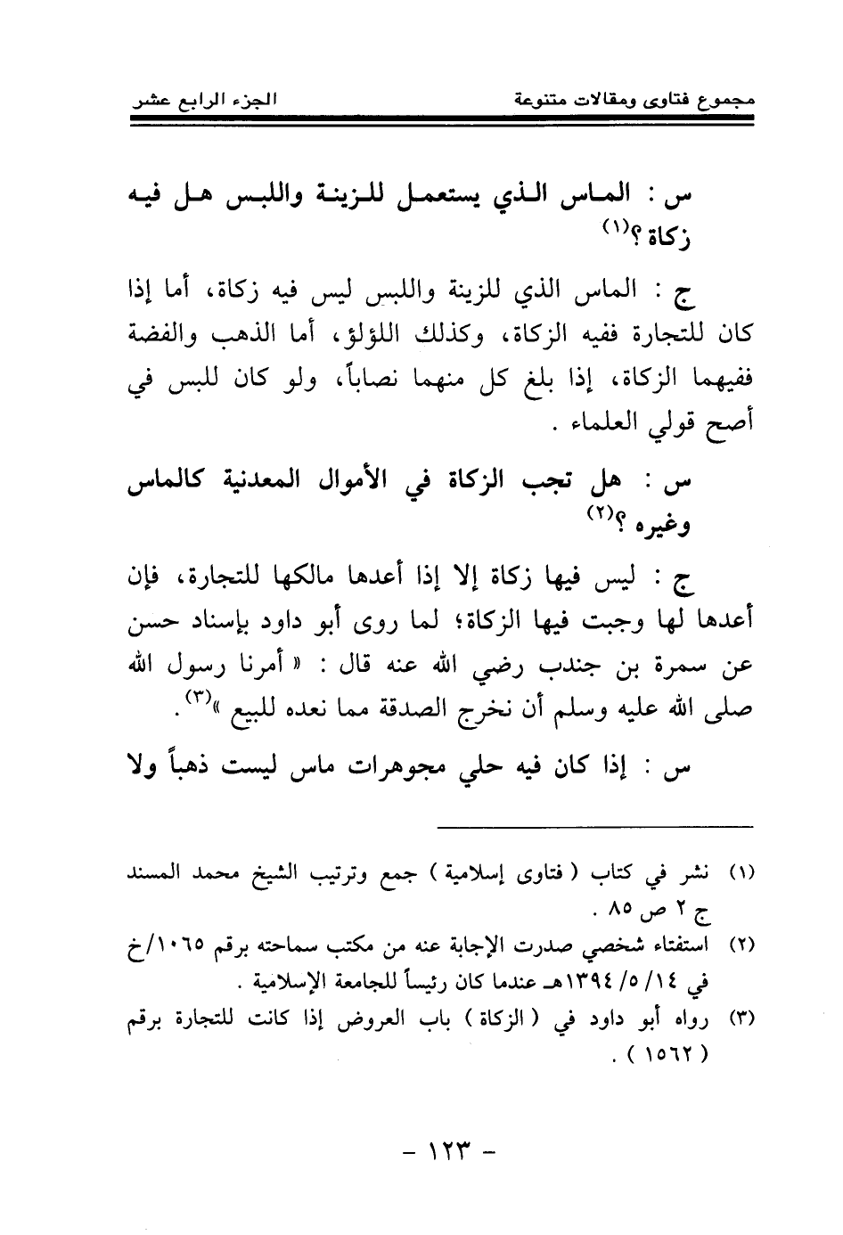 س: الماس الذي يستعمل للزينة واللبس هل فيه زكاة؟ (¬1)