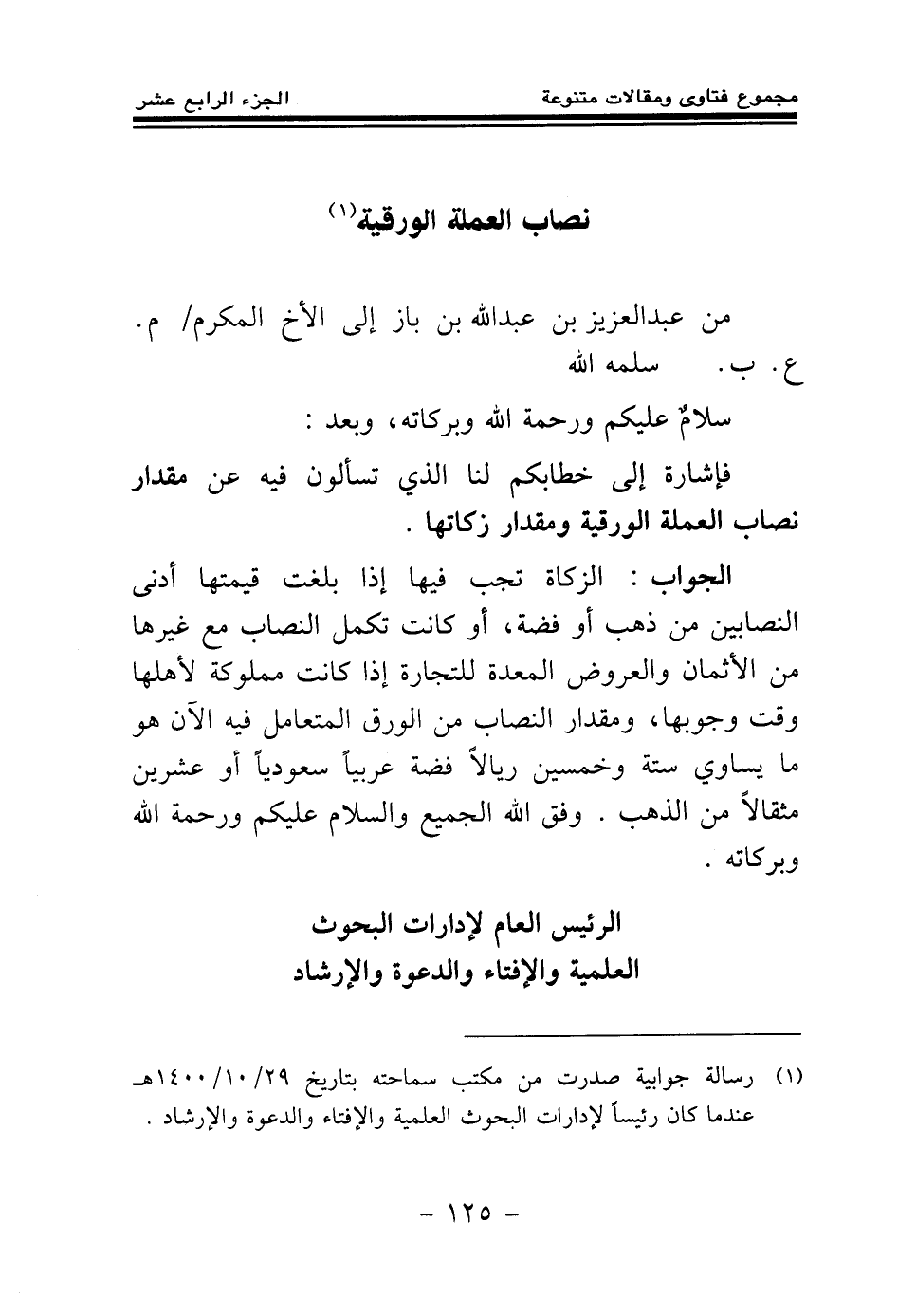 فإشارة إلى خطابكم لنا الذي تسألون فيه عن مقدار نصاب العملة الورقية ومقدار زكاتها.