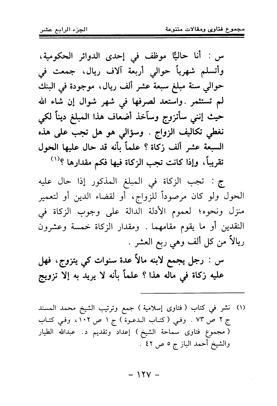 س: أنا حاليا موظف في إحدى الدوائر الحكومية، وأتسلم شهريا حوالي أربعة آلاف ريال، جمعت في حوالي سنة مبلغ سبعة عشر ألف ريال، موجودة في البنك لم تستثمر. واستعد لصرفها في شهر شوال - إن شاء الله - حيث إنني سأتزوج، وسآخذ أضعاف هذا المبلغ دينا لكي نغطي تكاليف الزواج. وسؤالي هو هل تجب على هذه السبعة عشر ألف زكاة؟ علما بأنه قد حال عليها الحول تقريبا، وإذا كانت تجب الزكاة فيها فكم مقدارها؟