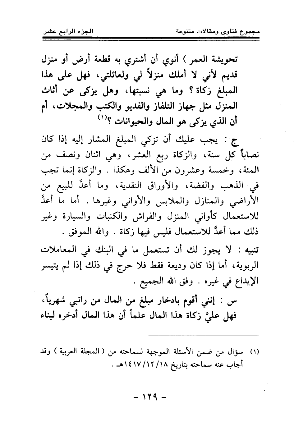تحويشة العمر) أنوي أن أشتري به قطعة أرض أو منزل قديم؛ لأني لا أملك منزلا لي ولعائلتي، فهل على هذا المبلغ زكاة؟ وما هي نسبتها، وهل يزكى عن أثاث المنزل مثل جهاز التلفاز والفيديو والكتب والمجلات، أم أن الذي يزكى هو المال والحيوانات؟ (¬1)