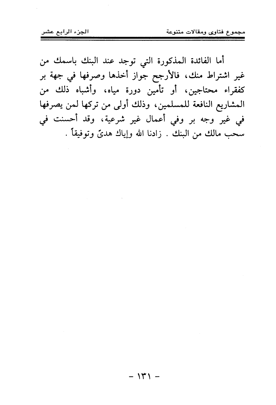 أما الفائدة المذكورة التي توجد عند البنك باسمك من غير اشتراط منك، فالأرجح جواز أخذها وصرفها في جهة بر كفقراء محتاجين، أو تأمين دورة مياه، وأشباه ذلك من المشاريع النافعة للمسلمين، وذلك أولى من تركها لمن يصرفها في غير وجه بر وفي أعمال غير شرعية، وقد أحسنت في سحب مالك من البنك. زادنا الله وإياك هدى وتوفيقا.