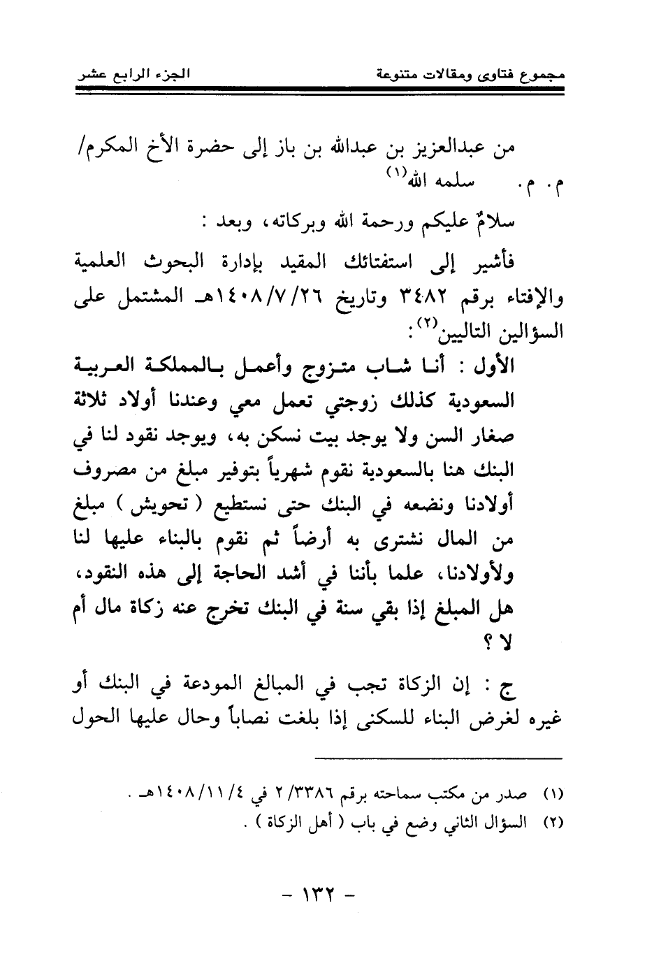 الأول: أنا شاب متزوج وأعمل بالمملكة العربية السعودية، كذلك زوجتي تعمل معي، وعندنا أولاد ثلاثة صغار السن، ولا يوجد بيت نسكن به، ويوجد نقود لنا في البنك هنا بالسعودية نقوم شهريا بتوفير مبلغ من مصروف أولادنا ونضعه في البنك حتى نستطيع (تحويش) مبلغ من المال نشتري به أرضا، ثم نقوم بالبناء عليها لنا ولأولادنا، علما بأننا في أشد الحاجة إلى هذه النقود، هل المبلغ إذا بقي سنة في البنك تخرج عنه زكاة مال أم لا؟