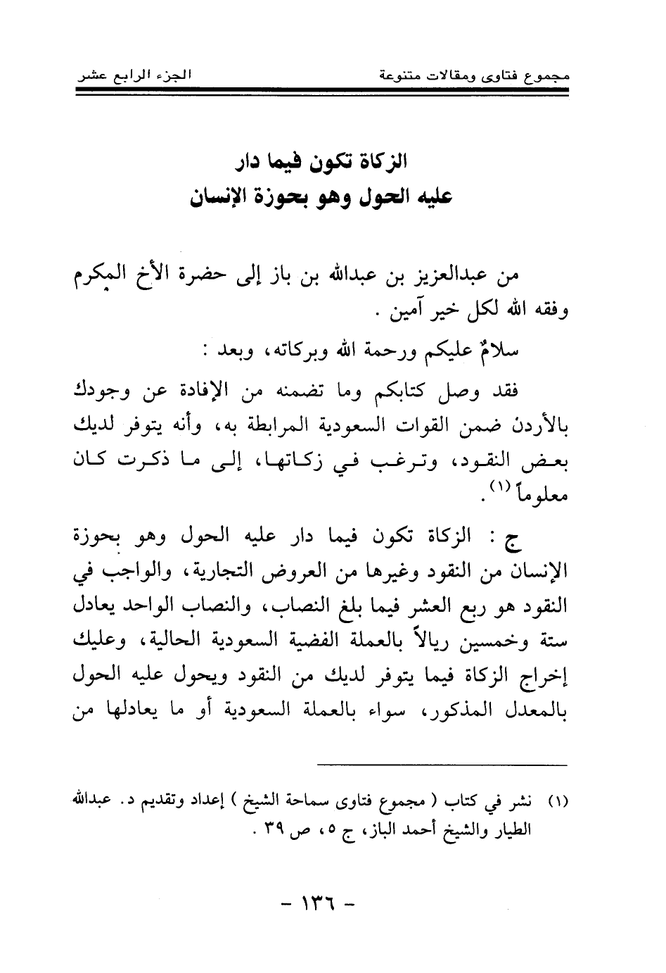 فقد وصل كتابكم وما تضمنه من الإفادة عن وجودك بالأردن ضمن القوات السعودية المرابطة به، وأنه يتوفر لديك بعض النقود، وترغب في زكاتها، إلى ما ذكرت كان معلوما (¬1) .