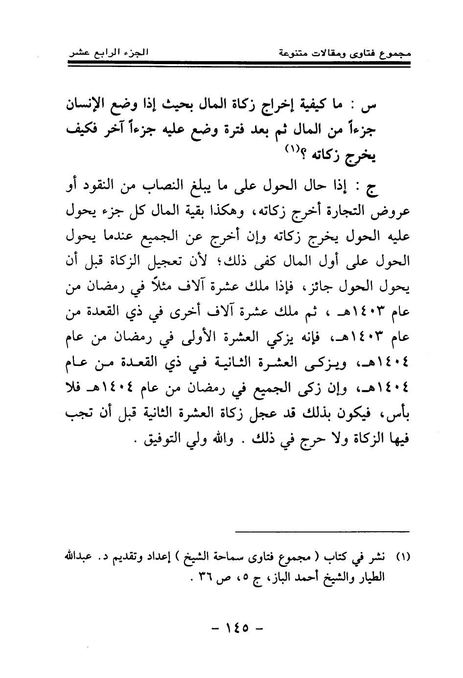 ج: إذا حال الحول على ما يبلغ النصاب من النقود أو عروض التجارة أخرج زكاته، وهكذا بقية المال كل جزء يحول عليه الحول يخرج زكاته وإن أخرج عن الجميع عندما يحول الحول على أول المال كفى ذلك؛ لأن تعجيل الزكاة قبل أن يحول الحول جائز، فإذا ملك عشرة آلاف مثلا في رمضان من عام 1403 هـ، ثم ملك عشرة آلاف أخرى في ذي القعدة من عام 1403 هـ، فإنه يزكي العشرة الأولى في رمضان من عام 1404 هـ، ويزكى العشرة الثانية في ذي القعدة من عام 1404 هـ، وإن زكى الجميع في رمضان من عام 1404 هـ فلا بأس، فيكون بذلك قد عجل زكاة العشرة الثانية قبل أن تجب فيها الزكاة ولا حرج في ذلك. والله ولي التوفيق.