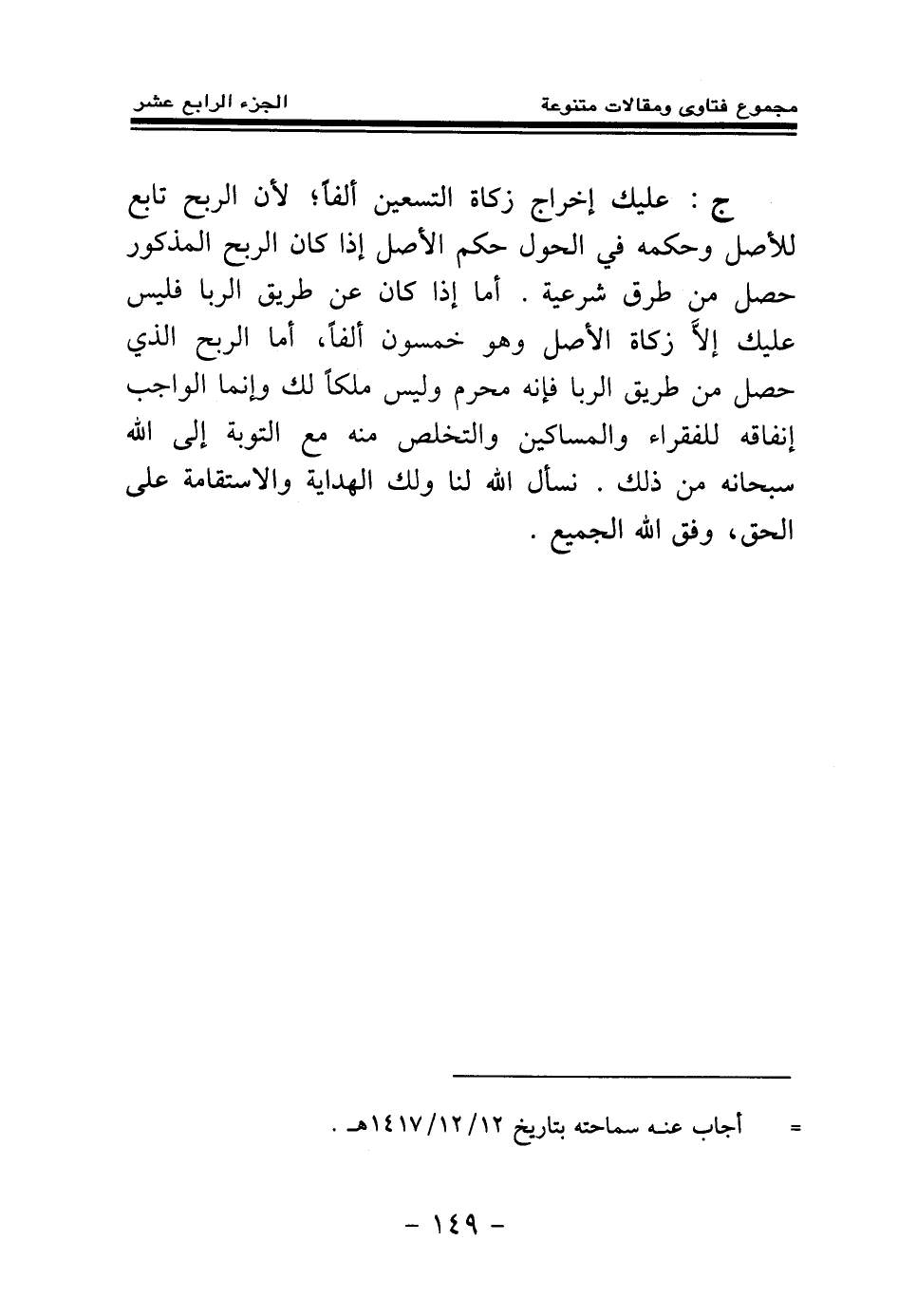 ج: عليك إخراج زكاة التسعين ألفا؛ لأن الربح تابع للأصل وحكمه في الحول حكم الأصل إذا كان الربح المذكور حصل من طرق شرعية، أما إذا كان عن طريق الربا فليس عليك إلا زكاة الأصل وهو خمسون ألفا، أما الربح الذي حصل من طريق الربا فإنه محرم وليس ملكا لك، وإنما الواجب إنفاقه للفقراء والمساكين والتخلص منه مع التوبة إلى الله سبحانه من ذلك، نسأل الله لنا ولك الهداية والاستقامة على الحق، وفق الله الجميع.