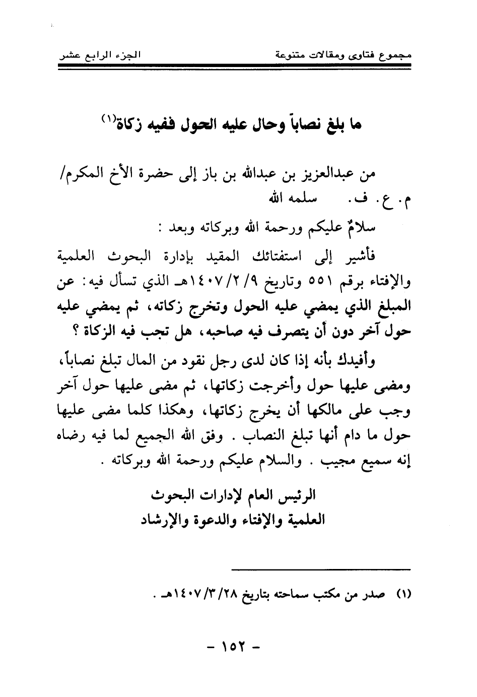فأشير إلى استفتائك المقيد بإدارة البحوث العلمية والإفتاء برقم 551 وتاريخ 9\2 \ 1407 هـ الذي تسأل فيه: عن المبلغ الذي يمضي عليه الحول وتخرج زكاته، ثم يمضي عليه حول آخر دون أن يتصرف فيه صاحبه، هل تجب فيه الزكاة؟