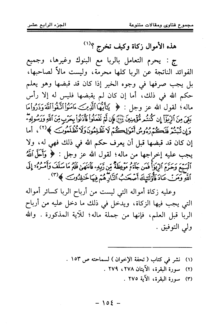 ج: يحرم التعامل بالربا مع البنوك وغيرها، وجميع الفوائد الناتجة عن الربا كلها محرمة، وليست مالا لصاحبها، بل يجب صرفها في وجوه الخير إذا كان قد قبضها وهو يعلم حكم الله في ذلك، أما إن كان لم يقبضها فليس له إلا رأس ماله لقول الله عز وجل: {يَا أَيُّهَا الَّذِينَ آمَنُوا اتَّقُوا اللَّهَ وَذَرُوا مَا بَقِيَ مِنَ الرِّبَا إِنْ كُنْتُمْ مُؤْمِنِينَ} (¬2) {فَإِنْ لَمْ تَفْعَلُوا فَأْذَنُوا بِحَرْبٍ مِنَ اللَّهِ وَرَسُولِهِ وَإِنْ تُبْتُمْ فَلَكُمْ رُءُوسُ أَمْوَالِكُمْ لَا تَظْلِمُونَ وَلَا تُظْلَمُونَ} (¬3) أما إن كان قد قبضها قبل أن يعرف حكم الله في ذلك فهي له، ولا يجب عليه إخراجها من ماله لقول الله عز وجل: {وَأَحَلَّ اللَّهُ الْبَيْعَ وَحَرَّمَ الرِّبَا فَمَنْ جَاءَهُ مَوْعِظَةٌ مِنْ رَبِّهِ فَانْتَهَى فَلَهُ مَا سَلَفَ وَأَمْرُهُ إِلَى اللَّهِ وَمَنْ عَادَ فَأُولَئِكَ أَصْحَابُ النَّارِ هُمْ فِيهَا خَالِدُونَ} (¬4)