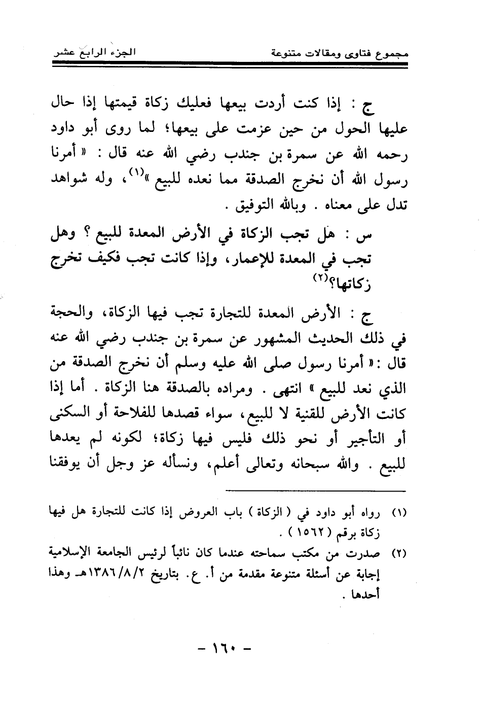ج: الأرض المعدة للتجارة تجب فيها الزكاة، والحجة في ذلك الحديث المشهور عن سمرة بن جندب رضي الله عنه قال: «أمرنا رسول صلى الله عليه وسلم أن نخرج الصدقة من الذي نعد للبيع (¬1) » انتهى. ومراده بالصدقة هنا الزكاة. أما إذا كانت الأرض للقنية لا للبيع، سواء قصدها للفلاحة أو السكنى أو التأجير أو نحو ذلك فليس فيها زكاة لكونه لم يعدها للبيع. والله سبحانه وتعالى أعلم، ونسأله عز وجل أن يوفقنا