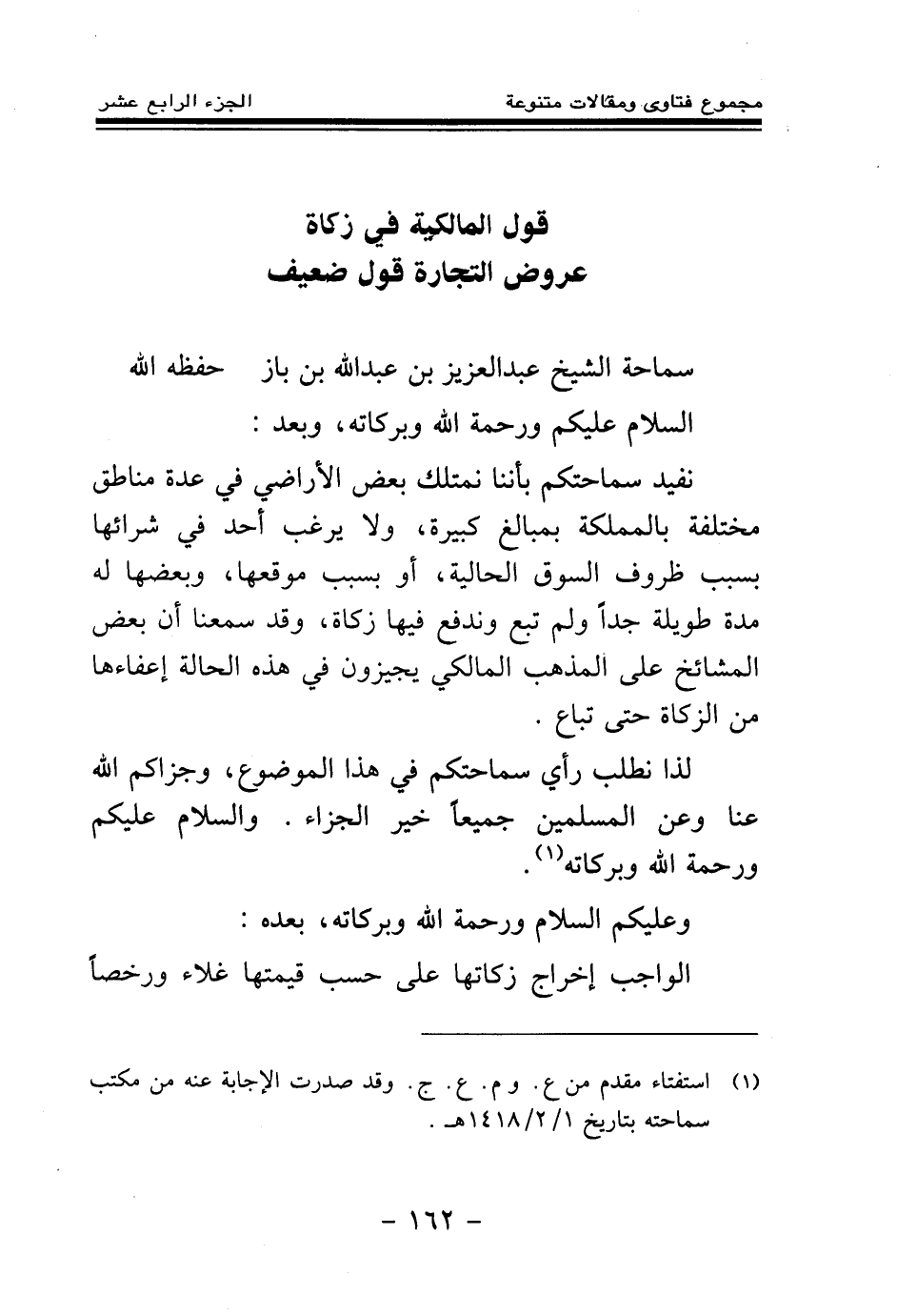 نفيد سماحتكم بأننا نمتلك بعض الأراضي في عدة مناطق مختلفة بالمملكة بمبالغ كبيرة، ولا يرغب أحد في شرائها بسبب ظروف السوق الحالية، أو بسبب موقعها، وبعضها له مدة طويلة جدا ولم تبع وندفع فيها زكاة، وقد سمعنا أن بعض المشايخ على المذهب المالكي يجيزون في هذه الحالة إعفاءها من الزكاة حتى تباع.