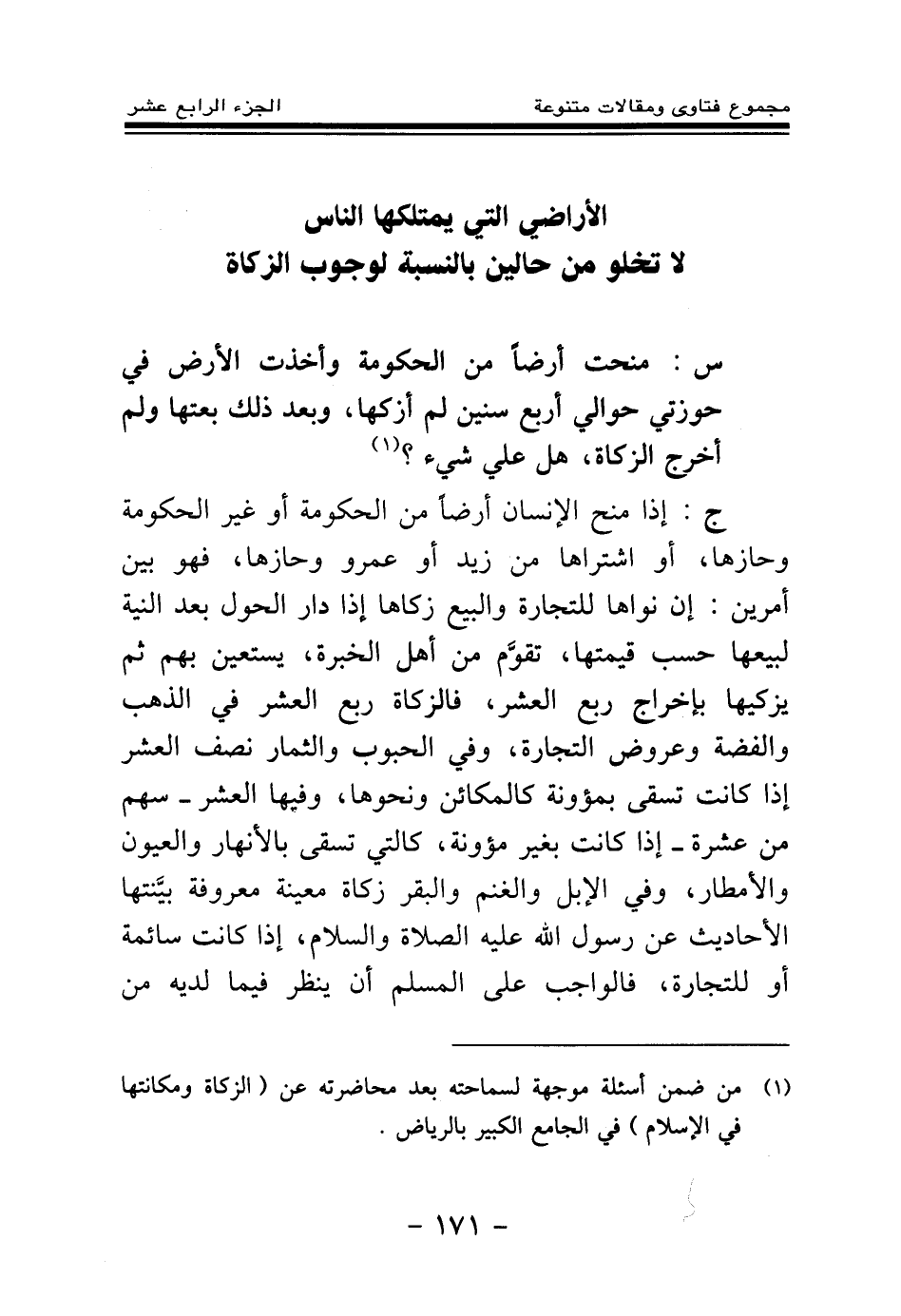 ج: إذا منح الإنسان أرضا من الحكومة أو غير الحكومة وحازها، أو اشتراها من زيد أو عمرو وحازها، فهو بين أمرين: إن نواها للتجارة والبيع زكاها إذا دار الحول بعد النية لبيعها حسب قيمتها، تقوم من أهل الخبرة، يستعين بهم ثم يزكيها بإخراج ربع العشر، فالزكاة ربع العشر في الذهب والفضة وعروض التجارة، وفي الحبوب والثمار نصف العشر إذا كانت تسقى بمئونة كالمكائن ونحوها، وفيها العشر- سهم من عشرة- إذا كانت بغير مئونة، كالتي تسقى بالأنهار والعيون والأمطار، وفي الإبل والغنم والبقر زكاة معينة معروفة بينتها الأحاديث عن رسول الله عليه الصلاة والسلام، إذا كانت سائمة أو للتجارة، فالواجب على المسلم أن ينظر فيما لديه من
