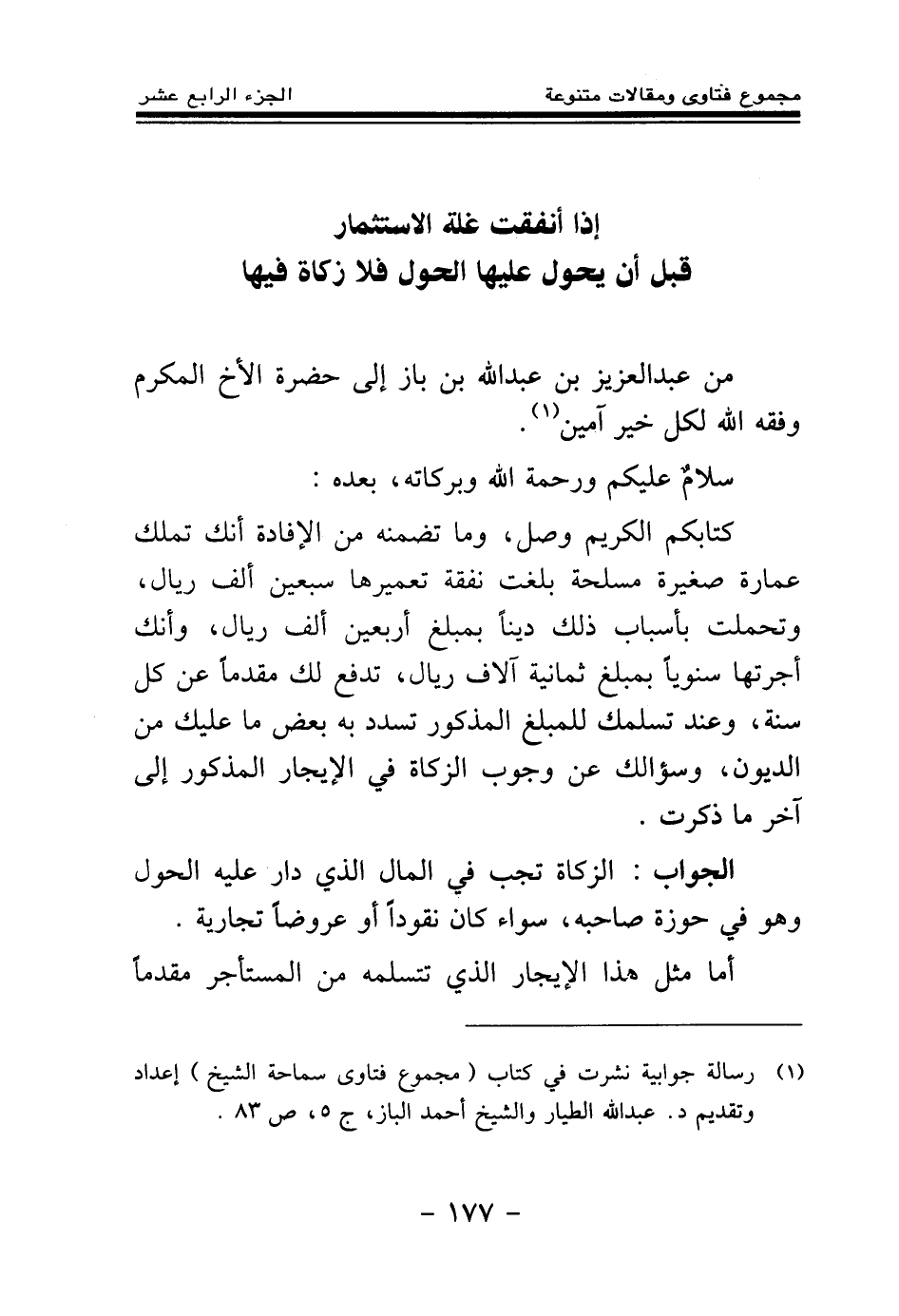 كتابكم الكريم وصل، وما تضمنه من الإفادة أنك تملك عمارة صغيرة مسلحة بلغت نفقة تعميرها سبعين ألف ريال، وتحملت بأسباب ذلك دينا بمبلغ أربعين ألف ريال، وأنك أجرتها سنويا بمبلغ ثمانية آلاف ريال، تدفع لك مقدما عن كل سنة، وعند تسلمك للمبلغ المذكور تسدد به بعض ما عليك من الديون، وسؤالك عن وجوب الزكاة في الإيجار المذكور إلى آخر ما ذكرت.