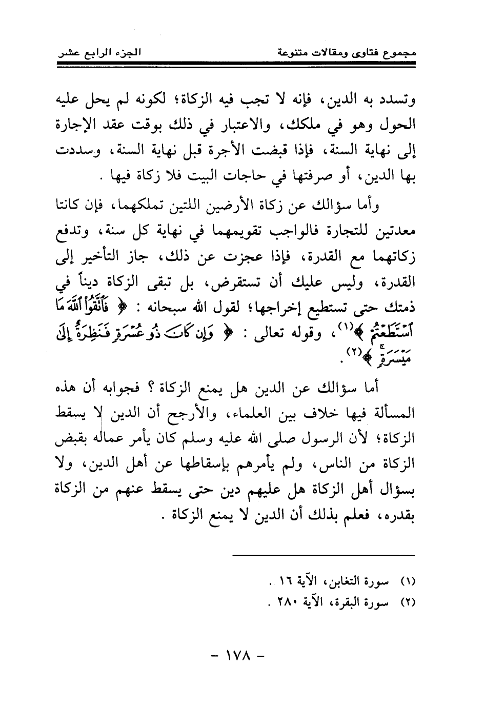وأما سؤالك عن زكاة الأرضين اللتين تملكهما، فإن كانتا معدتين للتجارة فالواجب تقويمهما في نهاية كل سنة، وتدفع زكاتهما مع القدرة، فإذا عجزت عن ذلك، جاز التأخير إلى القدرة، وليس عليك أن تستقرض، بل تبقى الزكاة دينا في ذمتك حتى تستطيع إخراجها لقول الله سبحانه: {فَاتَّقُوا اللَّهَ مَا اسْتَطَعْتُمْ} (¬1) وقوله تعالى: {وَإِنْ كَانَ ذُو عُسْرَةٍ فَنَظِرَةٌ إِلَى مَيْسَرَةٍ} (¬2)