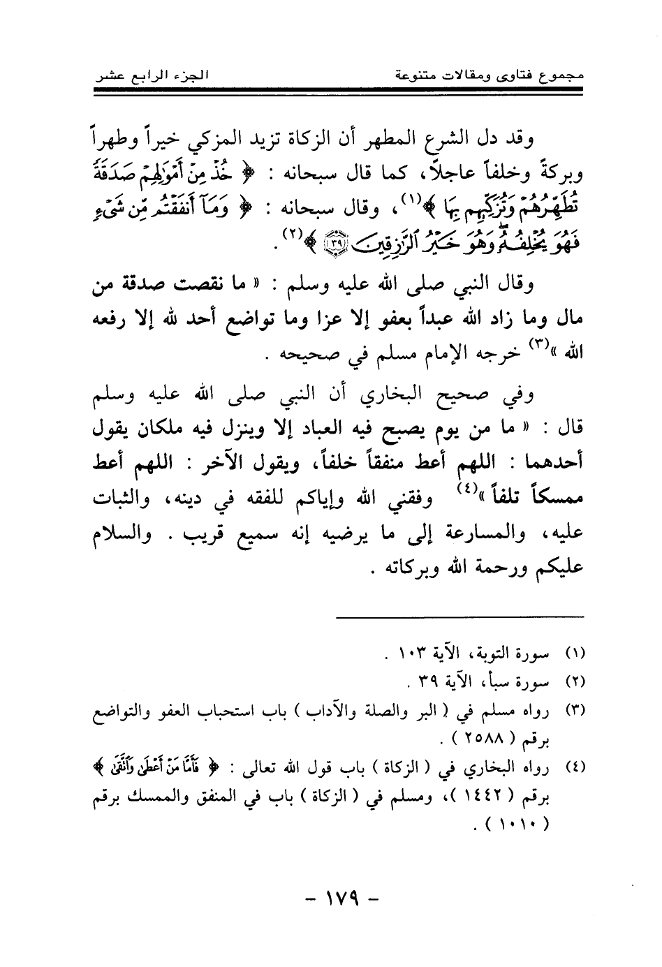 وقد دل الشرع المطهر أن الزكاة تزيد المزكي خيرا وطهرا وبركة وخلفا عاجلا، كما قال سبحانه: {خُذْ مِنْ أَمْوَالِهِمْ صَدَقَةً تُطَهِّرُهُمْ وَتُزَكِّيهِمْ بِهَا} (¬1) وقال سبحانه: {وَمَا أَنْفَقْتُمْ مِنْ شَيْءٍ فَهُوَ يُخْلِفُهُ وَهُوَ خَيْرُ الرَّازِقِينَ} (¬2)