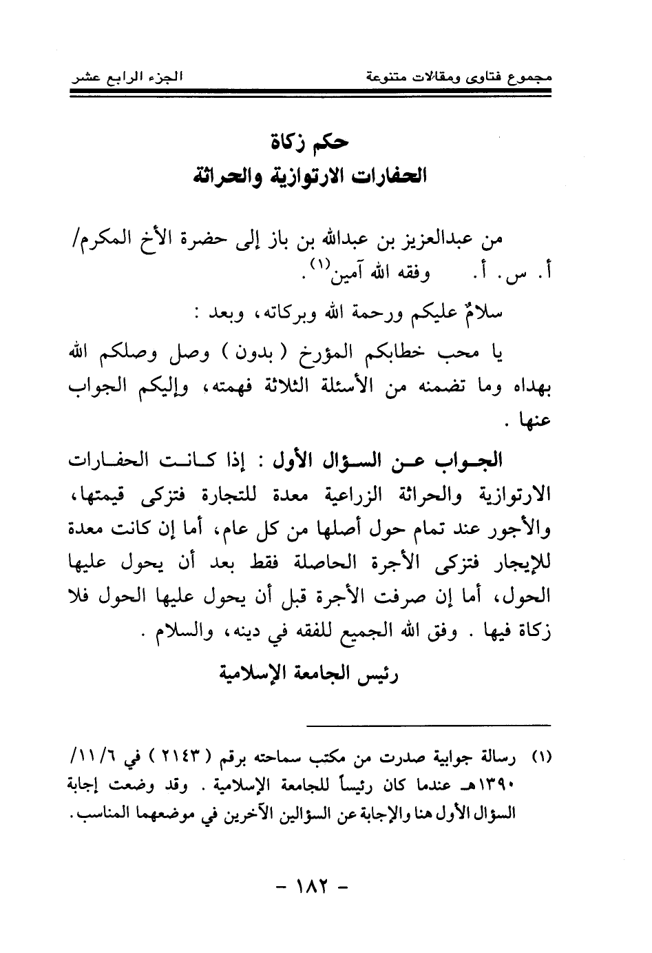 الجواب عن السؤال الأول: إذا كانت الحفارات الارتوازية والحراثة الزراعية معدة للتجارة فتزكى قيمتها، والأجور عند تمام حول أصلها من كل عام، أما إن كانت معدة للإيجار فتزكى الأجرة الحاصلة فقط بعد أن يحول عليها الحول، أما إن صرفت الأجرة قبل أن يحول عليها الحول فلا زكاة فيها، وفق الله الجميع للفقه في دينه، والسلام.