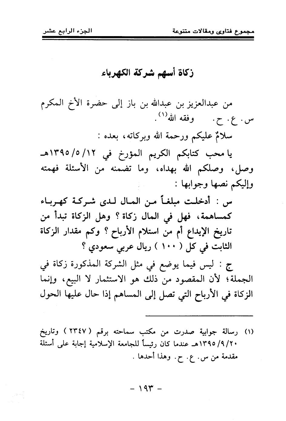 من عبد العزيز بن عبد الله بن باز إلى حضرة الأخ المكرم س. ع. ح. وفقه الله.