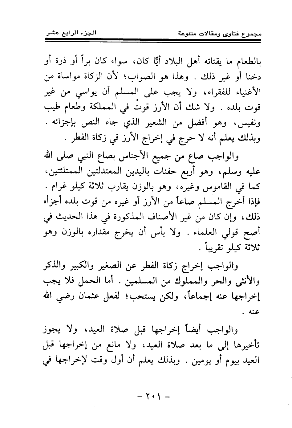 والواجب صاع من جميع الأجناس بصاع النبي صلى الله عليه وسلم، وهو أربع حفنات باليدين المعتدلتين الممتلئتين، كما في القاموس وغيره، وهو بالوزن يقارب ثلاثة كيلو غرام، فإذا أخرج المسلم صاعا من الأرز أو غيره من قوت بلده أجزأه ذلك، وإن كان من غير الأصناف المذكورة في هذا الحديث في أصح قولي العلماء، ولا بأس أن يخرج مقداره بالوزن وهو ثلاثة كيلو تقريبا.