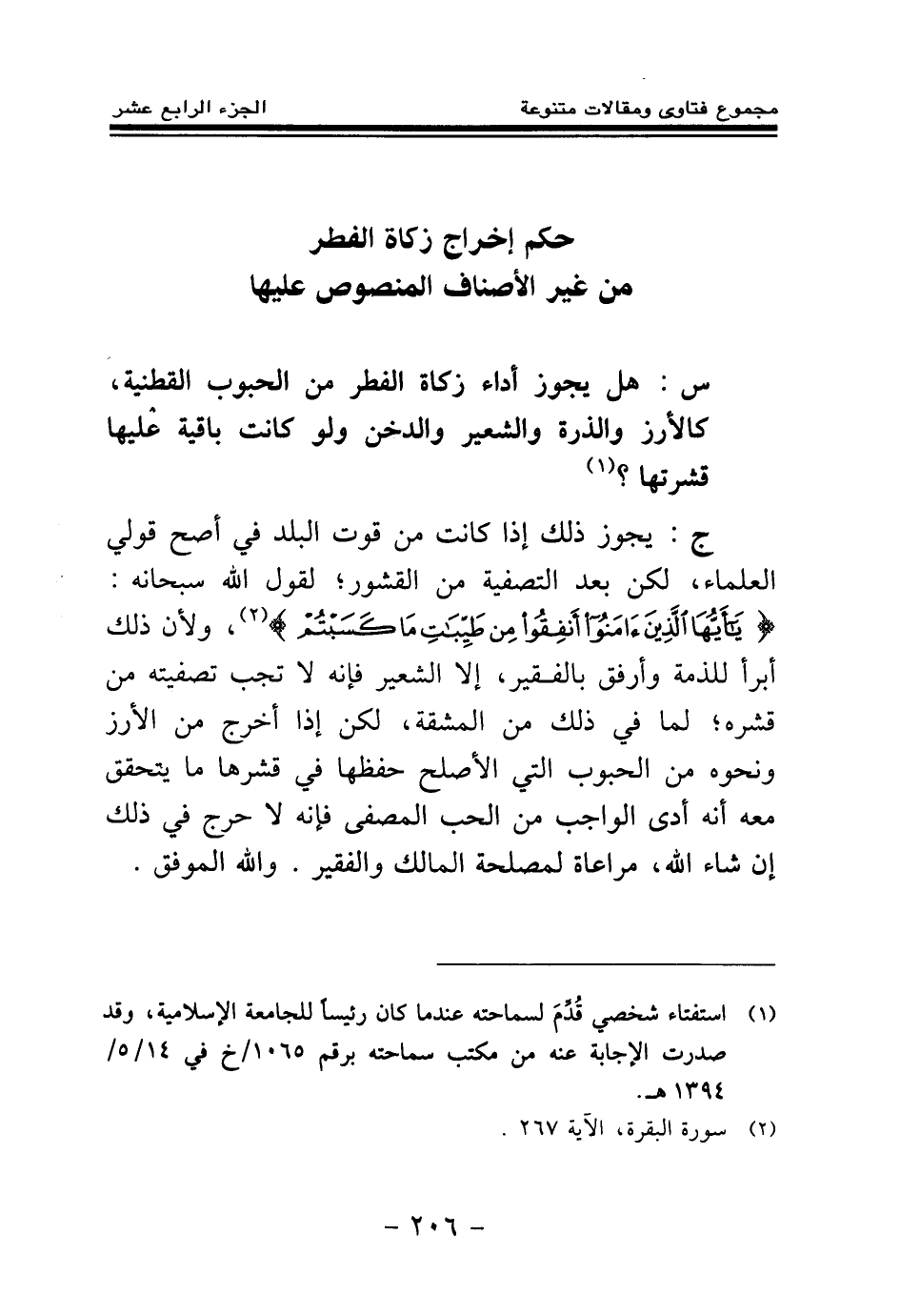 ج: يجوز ذلك إذا كانت من قوت البلد في أصح قولي العلماء، لكن بعد التصفية من القشور لقول الله سبحانه: {يَا أَيُّهَا الَّذِينَ آمَنُوا أَنْفِقُوا مِنْ طَيِّبَاتِ مَا كَسَبْتُمْ} (¬1) ولأن ذلك أبرأ للذمة وأرفق بالفقير، إلا الشعير فإنه لا تجب تصفيته من قشره لما في ذلك من المشقة، لكن إذا أخرج من الأرز ونحوه من الحبوب التي الأصلح حفظها في قشرها ما يتحقق معه أنه أدى الواجب من الحب المصفى فإنه لا حرج في ذلك إن شاء الله، مراعاة لمصلحة المالك والفقير. والله الموفق.