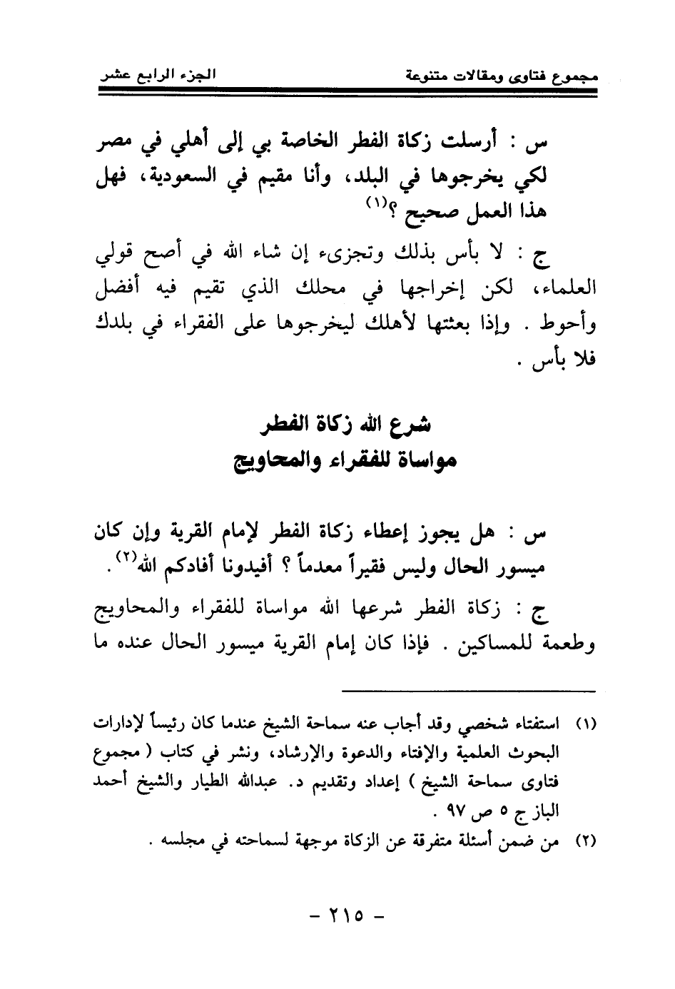 ج: زكاة الفطر شرعها الله مواساة للفقراء والمحاويج وطعمة للمساكين، فإذا كان إمام القرية ميسور الحال عنده ما