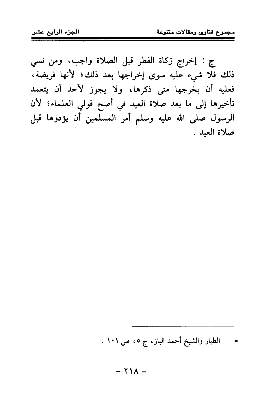 ج: إخراج زكاة الفطر قبل الصلاة واجب، ومن نسي ذلك فلا شيء عليه سوى إخراجها بعد ذلك؛ لأنها فريضة، فعليه أن يخرجها متى ذكرها، ولا يجوز لأحد أن يتعمد تأخيرها إلى ما بعد صلاة العيد في أصح قولي العلماء؛ لأن الرسول صلى الله عليه وسلم أمر المسلمين أن يؤدوها قبل صلاة العيد.