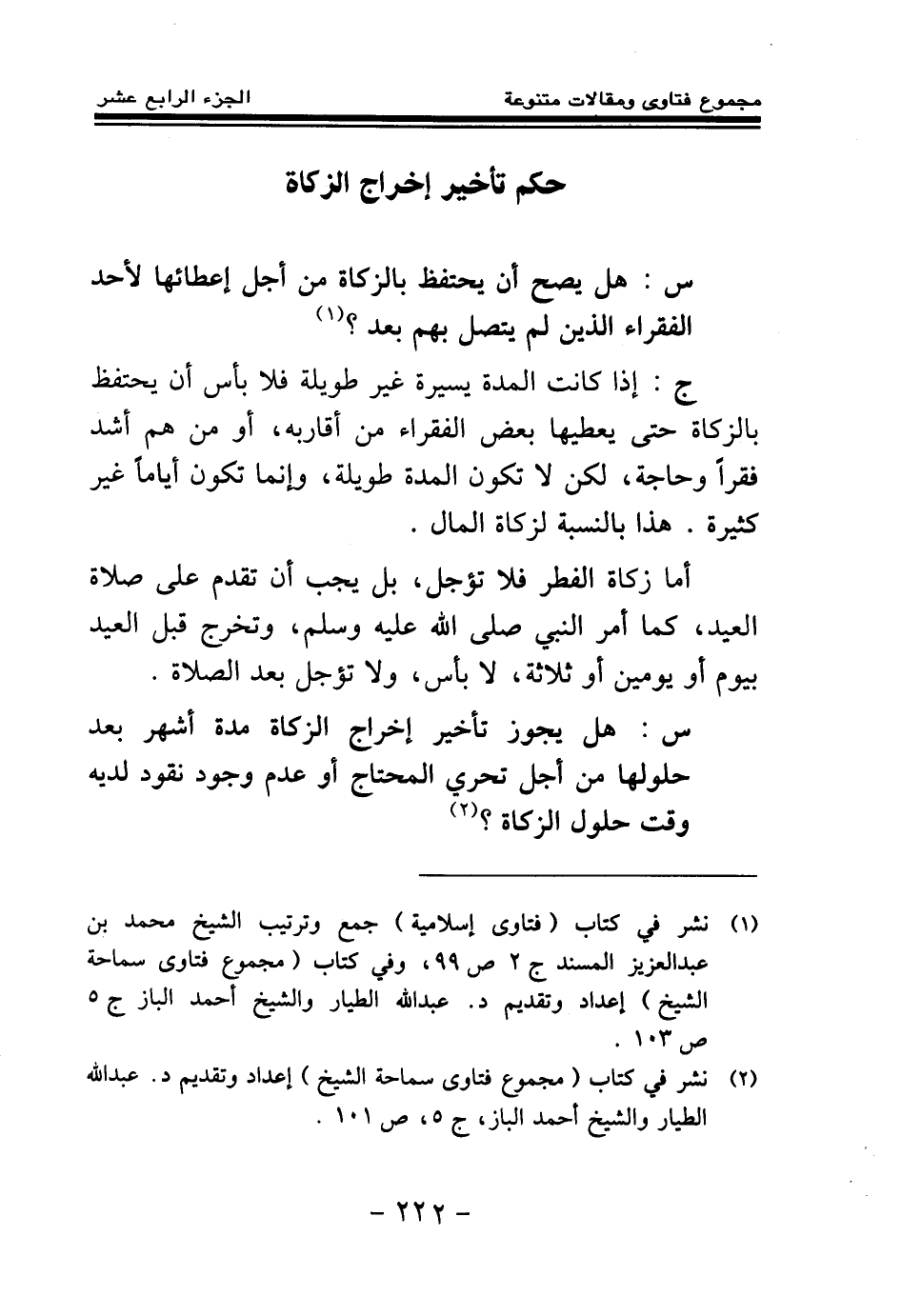 ج: إذا كانت المدة يسيرة غير طويلة فلا بأس أن يحتفظ بالزكاة حتى يعطيها بعض الفقراء من أقاربه، أو من هم أشد فقرا وحاجة، لكن لا تكون المدة طويلة، وإنما لا تكون أياما غير كثيرة، هذا بالنسبة لزكاة المال.