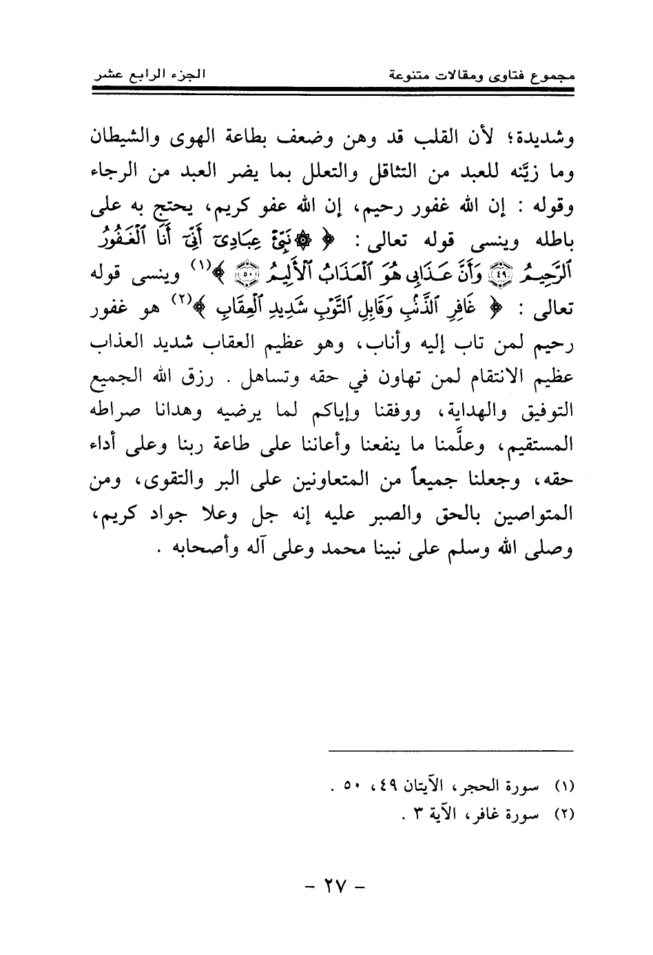 وشديدة؛ لأن القلب قد وهن وضعف بطاعة الهوى والشيطان وما زينه للعبد من التثاقل والتعلل بما يضر العبد من الرجاء، وقوله: إن الله غفور رحيم، إن الله عفو كريم، يحتج به على باطله وينسى قوله تعالى: {نَبِّئْ عِبَادِي أَنِّي أَنَا الْغَفُورُ الرَّحِيمُ} (¬1) {وَأَنَّ عَذَابِي هُوَ الْعَذَابُ الْأَلِيمُ} (¬2) وينسى قوله تعالى: {غَافِرِ الذَّنْبِ وَقَابِلِ التَّوْبِ شَدِيدِ الْعِقَابِ ذِي الطَّوْلِ لَا إِلَهَ إِلَّا هُوَ إِلَيْهِ الْمَصِيرُ} (¬3) هو غفور رحيم لمن تاب إليه وأناب، وهو عظيم العقاب شديد العذاب عظيم الانتقام لمن تهاون في حقه وتساهل. رزق الله الجميع التوفيق والهداية، ووفقنا وإياكم لما يرضيه، وهدانا صراطه المستقيم، وعلمنا ما ينفعنا وأعاننا على طاعة ربنا وعلى أداء حقه، وجعلنا جميعا من المتعاونين على البر والتقوى، ومن المتواصين بالحق والصبر عليه، إنه جل وعلا جواد كريم، وصلى الله وسلم على نبينا محمد وعلى آله وأصحابه.