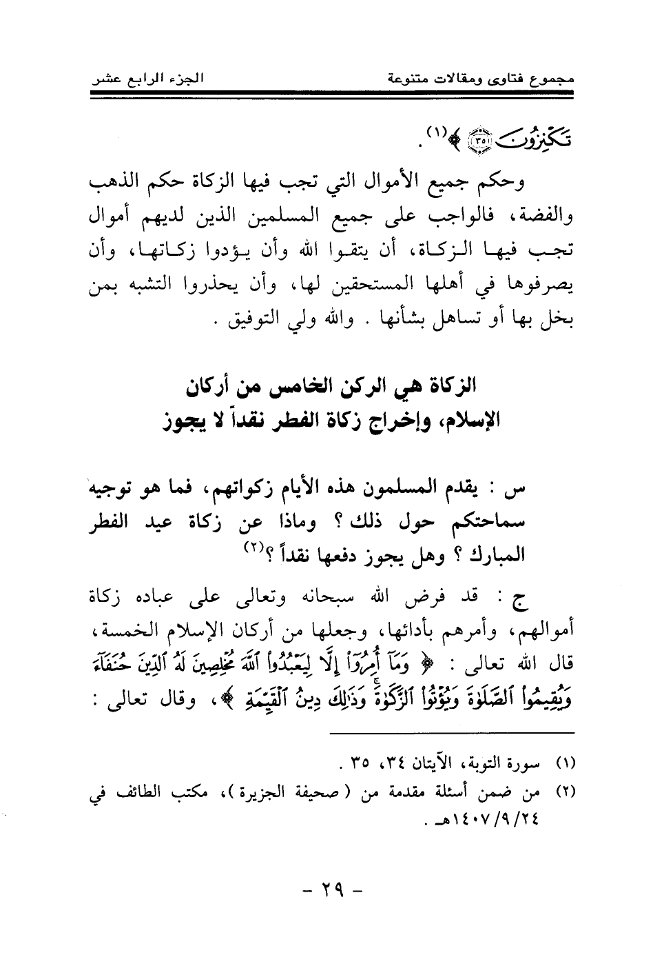 س: يقدم المسلمون هذه الأيام زكواتهم، فما هو توجيه سماحتكم حول ذلك؟ وماذا عن زكاة عيد الفطر المبارك؟ وهل يجوز دفعها نقدا؟ (¬1) .