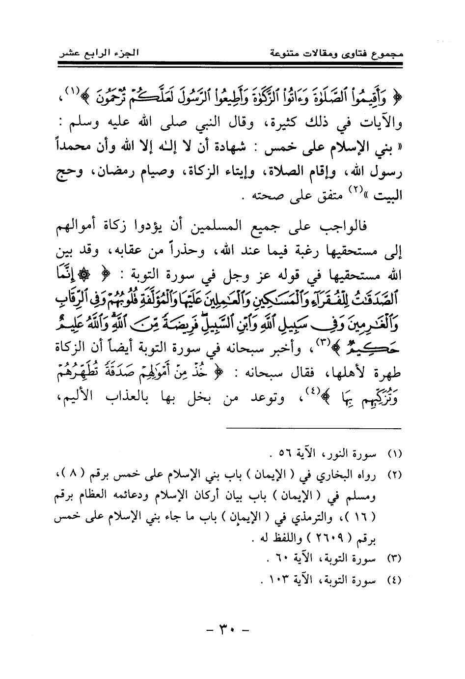 {وَأَقِيمُوا الصَّلَاةَ وَآتُوا الزَّكَاةَ وَأَطِيعُوا الرَّسُولَ لَعَلَّكُمْ تُرْحَمُونَ} (¬1) والآيات في ذلك كثيرة، وقال النبي - صلى الله عليه وسلم -: «بني الإسلام على خمس: شهادة أن لا إله إلا الله وأن محمدا رسول الله، وإقام الصلاة، وإيتاء الزكاة، وصيام رمضان، وحج البيت (¬2) » متفق على صحته.