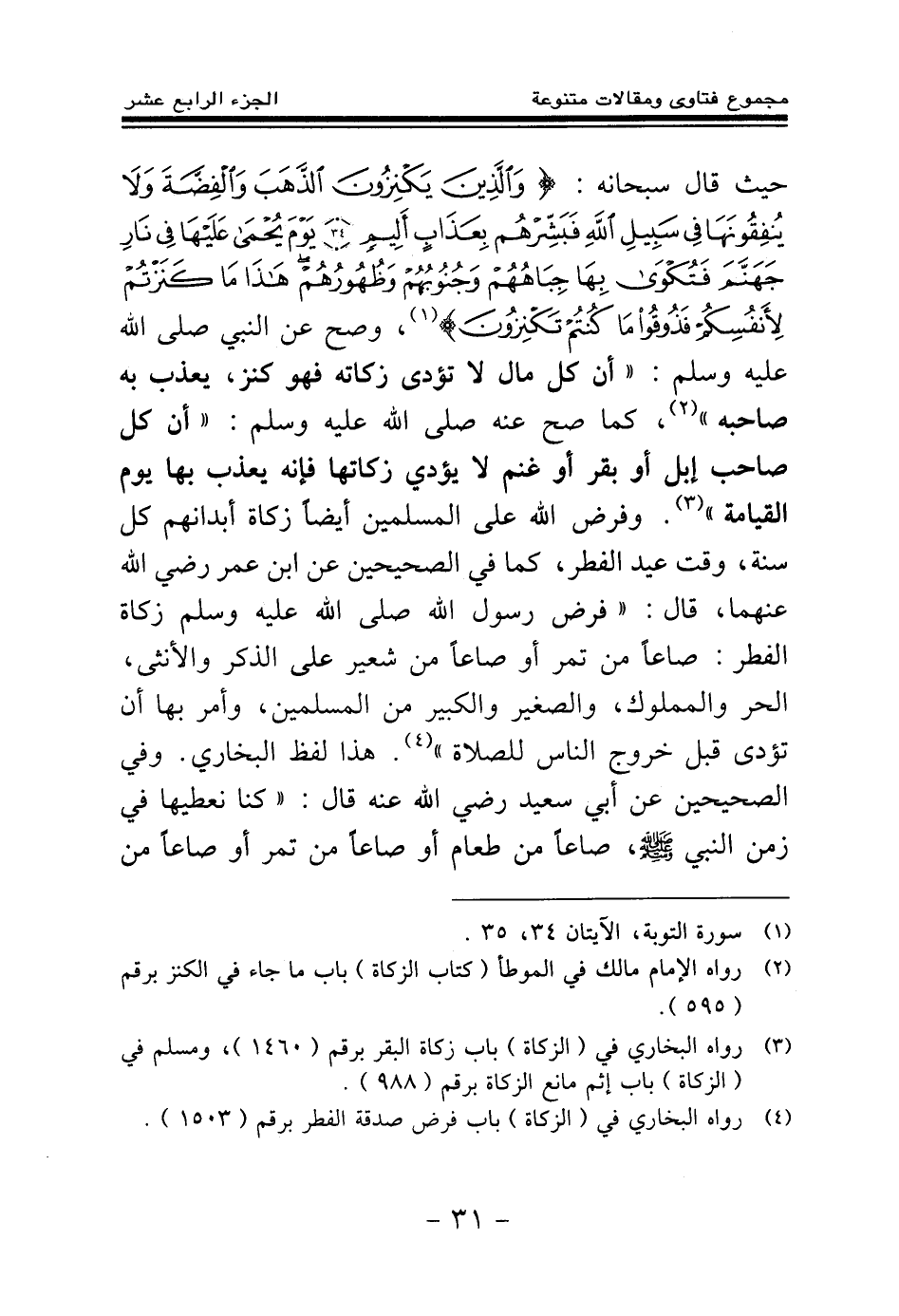 حيث قال سبحانه: {وَالَّذِينَ يَكْنِزُونَ الذَّهَبَ وَالْفِضَّةَ وَلَا يُنْفِقُونَهَا فِي سَبِيلِ اللَّهِ فَبَشِّرْهُمْ بِعَذَابٍ أَلِيمٍ} (¬1) {يَوْمَ يُحْمَى عَلَيْهَا فِي نَارِ جَهَنَّمَ فَتُكْوَى بِهَا جِبَاهُهُمْ وَجُنُوبُهُمْ وَظُهُورُهُمْ هَذَا مَا كَنَزْتُمْ لِأَنْفُسِكُمْ فَذُوقُوا مَا كُنْتُمْ تَكْنِزُونَ} (¬2) وصح عن النبي - صلى الله عليه وسلم -: «أن كل مال لا تؤدى زكاته فهو كنز، يعذب به صاحبه (¬3) » ، كما صح عنه - صلى الله عليه وسلم -: «أن كل صاحب إبل أو بقر أو غنم لا يؤدي زكاتها فإنه يعذب بها يوم القيامة (¬4) » .