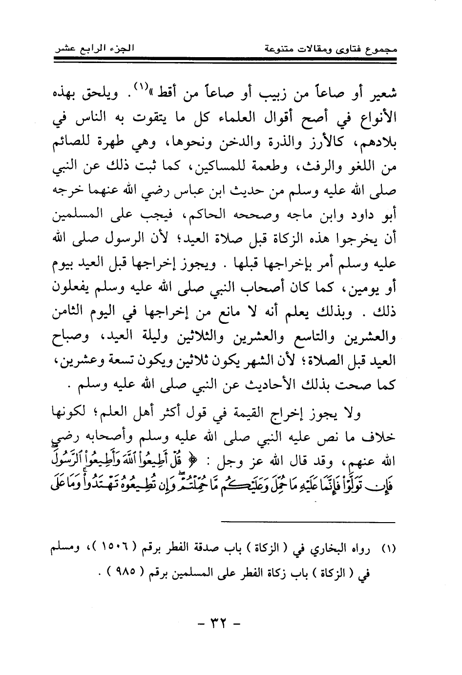 شعير أو صاعا من زبيب أو صاعا من أقط (¬1) » ، ويلحق بهذه الأنواع في أصح أقوال العلماء كل ما يتقوت به الناس في بلادهم، كالأرز والذرة والدخن ونحوها، وهي طهرة للصائم من اللغو والرفث، وطعمة للمساكين، كما ثبت ذلك عن النبي - صلى الله عليه وسلم - من حديث ابن عباس - رضي الله عنهما - خرجه أبو داود وابن ماجه، وصححه الحاكم، فيجب على المسلمين أن يخرجوا هذه الزكاة قبل صلاة العيد؛ لأن الرسول - صلى الله عليه وسلم - أمر بإخراجها قبلها. ويجوز إخراجها قبل العيد بيوم أو يومين، كما كان أصحاب النبي - صلى الله عليه وسلم - يفعلون ذلك. وبذلك يعلم أنه لا مانع من إخراجها في اليوم الثامن والعشرين والتاسع والعشرين والثلاثين وليلة العيد، وصباح العيد قبل الصلاة؛ لأن الشهر يكون ثلاثين ويكون تسعة وعشرين، كما صحت بذلك الأحاديث عن النبي - صلى الله عليه وسلم -.