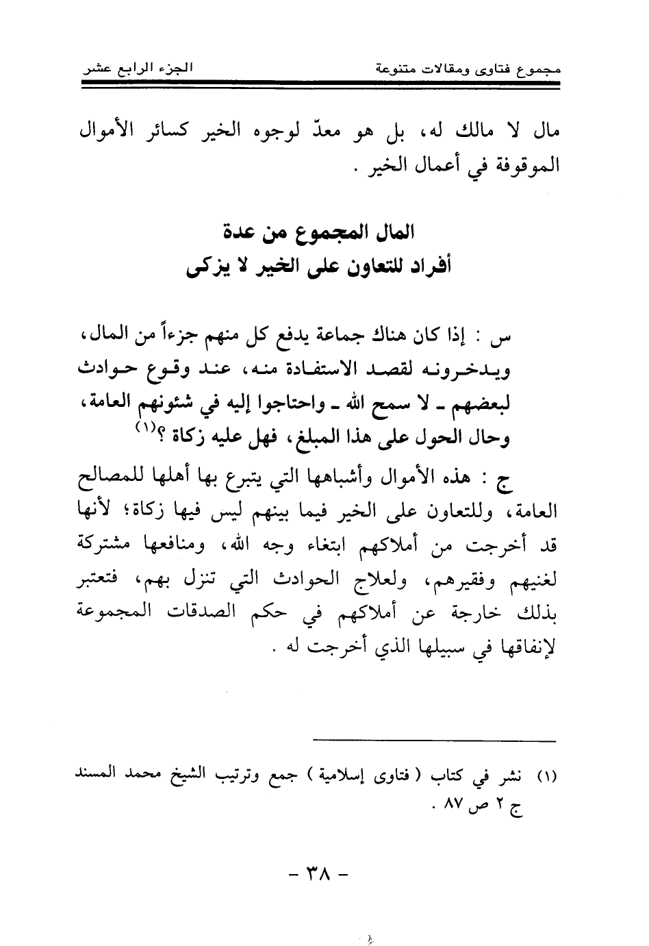 س. إذا كان هناك جماعة يدفع كل منهم جزءا من المال، ويدخرونه لقصد الاستفادة منه، عند وقوع حوادث لبعضهم - لا سمح الله - واحتاجوا إليه في شئونهم العامة، وحال الحول على هذا المبلغ، فهل عليه زكاة؟ (¬1) .